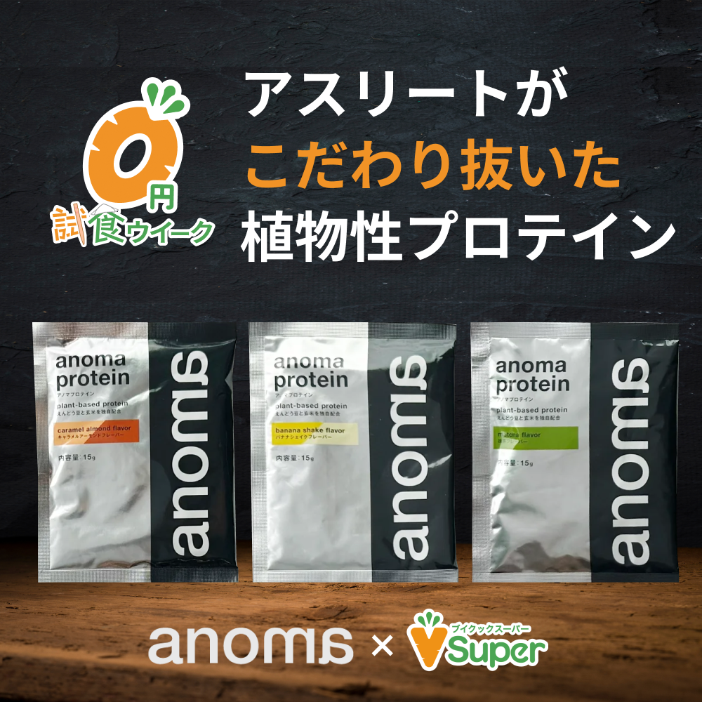 anomaプロテインは、アスリートがこだわり抜いた、えんどう豆・玄米タンパクからできた植物性プロテインです。ブイクック試食ウィークでは、人気の3フレーバー(抹茶・バナナシェイク・キャラメルアーモンド)をお試しいただけます。