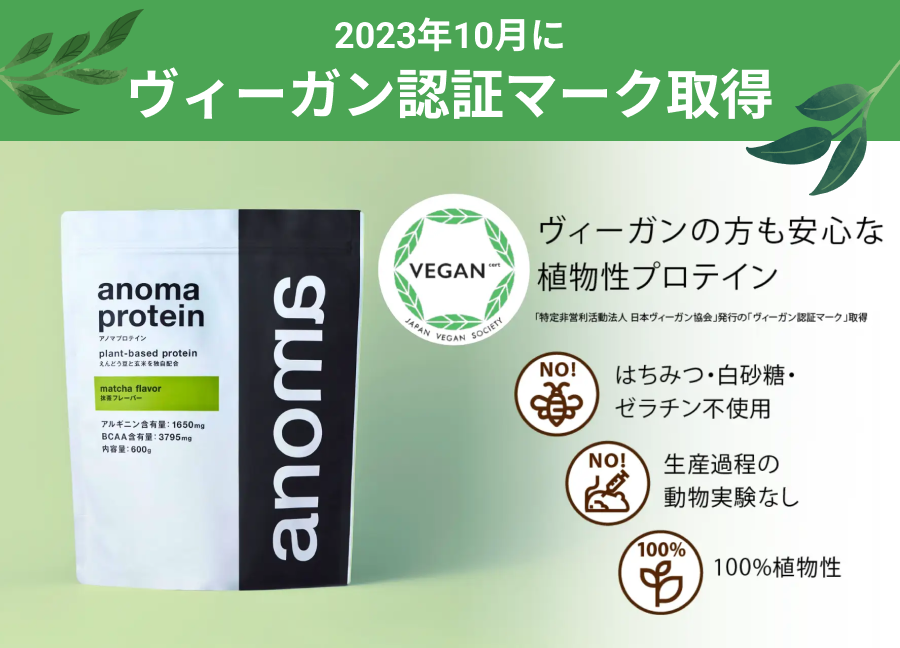 anomaプロテインは、2023年10月にヴィーガン認証マークを取得しました。