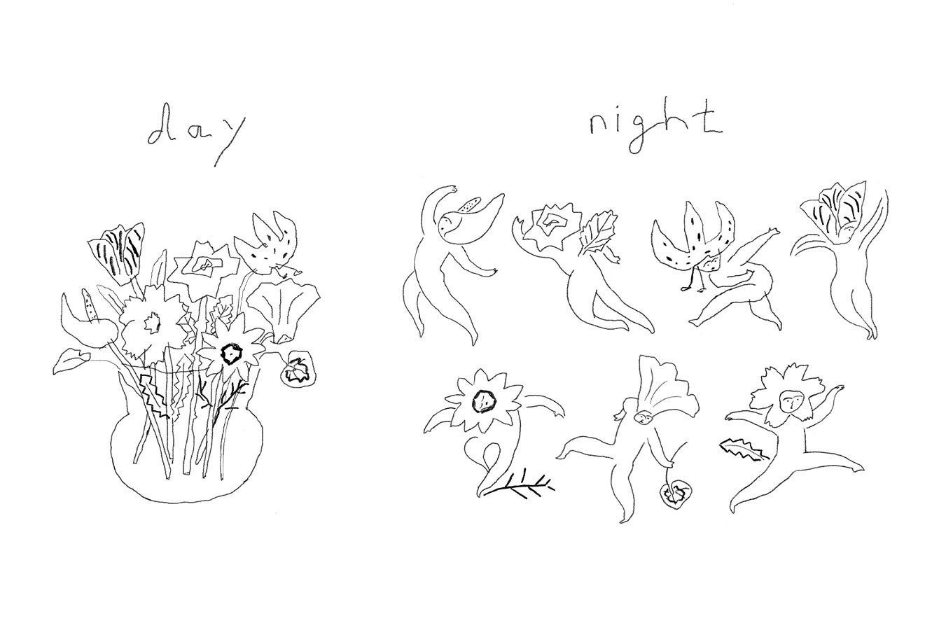 昼間は花瓶に入っているお花たちが、人が寝静まった夜にダンスをしている。そんなチャーミングなデザインです。