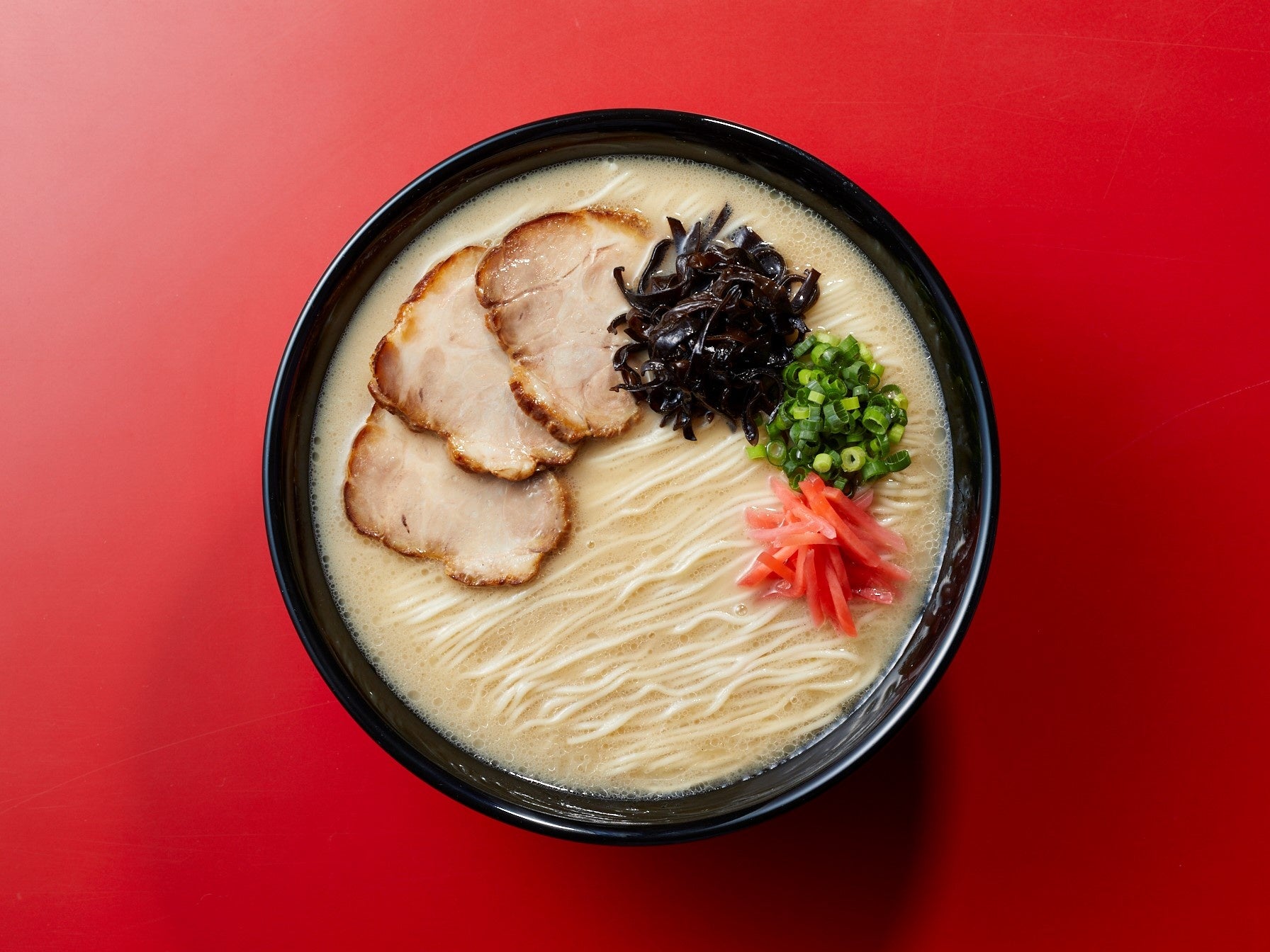 砕き豚骨、豚頭を使用した、だしの旨味をしっかり抽出した本格仕立てスープは、とろりとした質感、まろやかで甘味のある仕上がり。本場博多豚骨ラーメンを思わせる、細麺ながらしっかりとした歯ごたえ、濃厚なスープがよく絡む低加水で仕上げた麺。香ばしにんにく風味油が食欲を誘います。