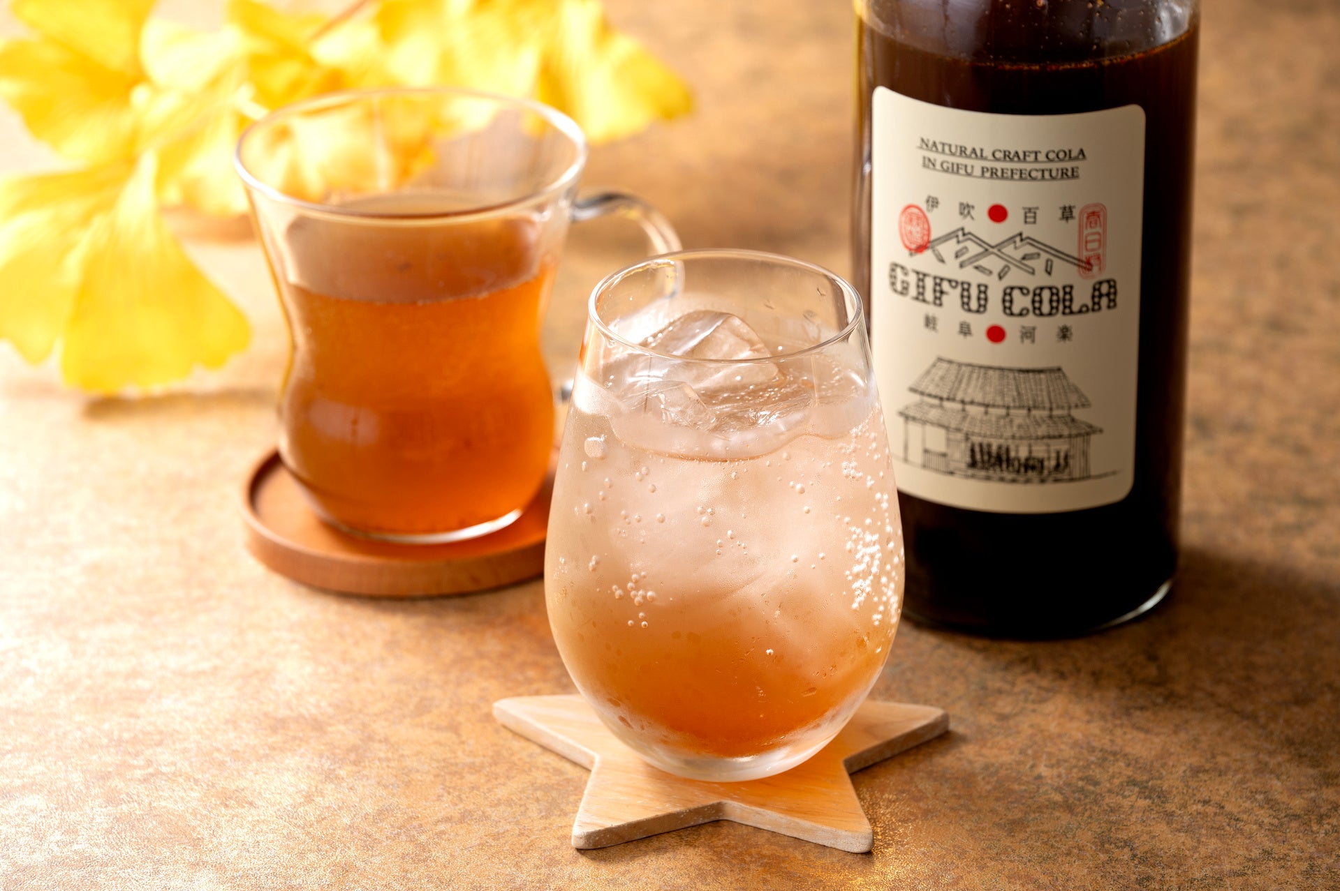 ヨモギ、ヤブニッケイ、カキドオシ、ドクダミ 4種類の薬草がブレンドされているクラフトコーラ「ぎふコーラ」。薬草の他にも、オールスパイスやきび砂糖、コーラナッツ等が組み合わさっており、絶妙な味のバランスがクセになるドリンクです。
