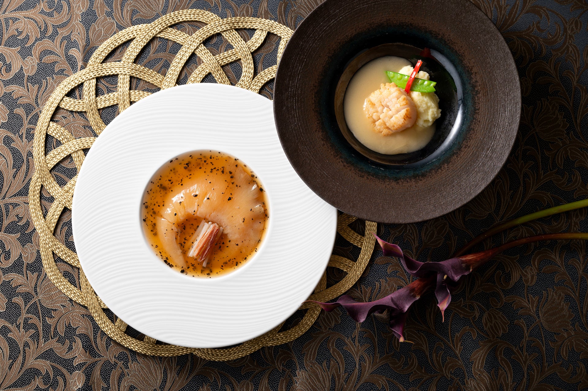 ・生帆立貝の煎り焼き エシレバターと金華ハムのソース