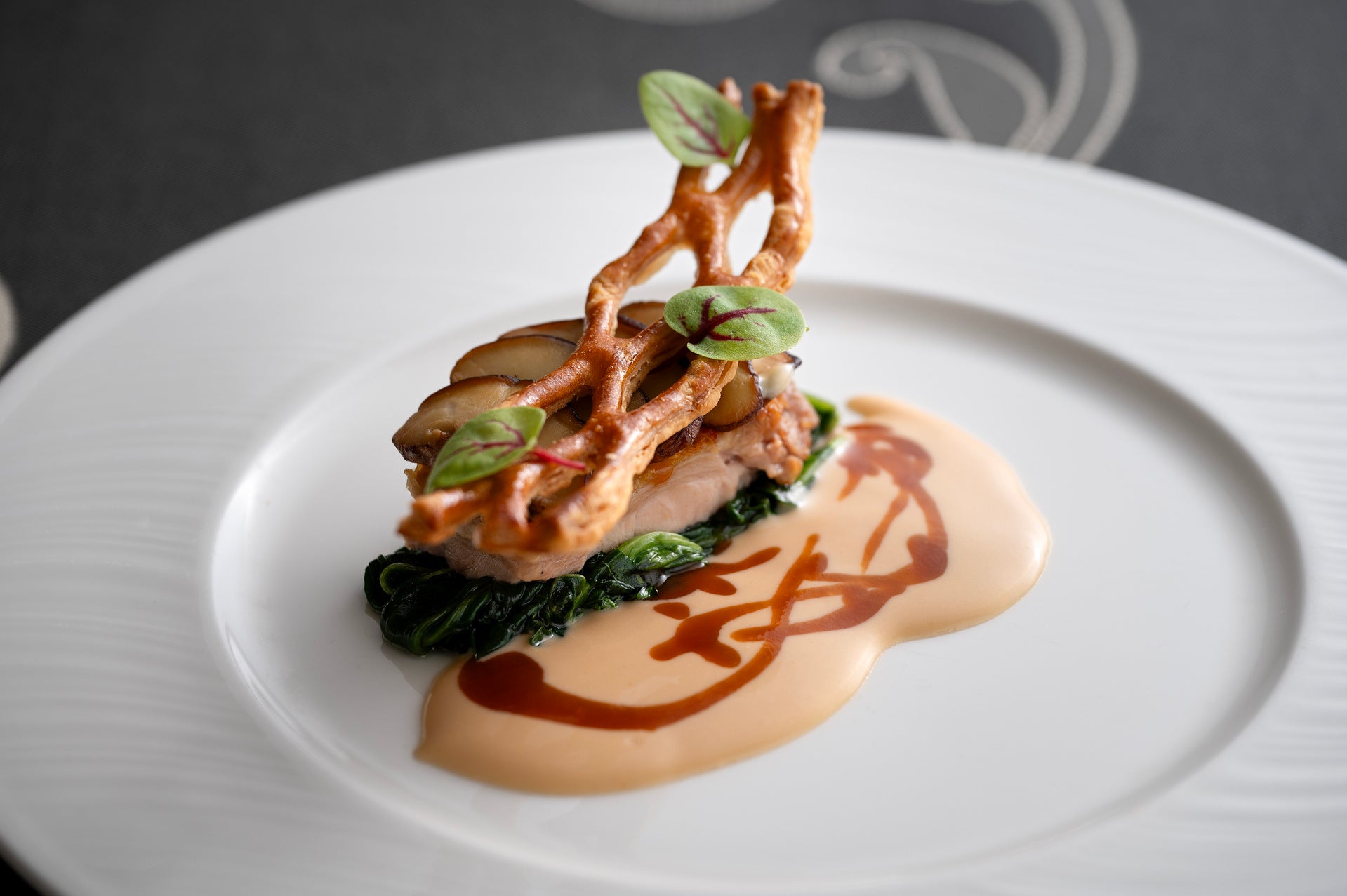 豊かな脂の味わいと赤身の甘みが絶品な“飛騨牛”は、素材本来の味や香りが楽しめるソースで。ジューシーな“恵那どり”のロティは、肉厚な“やまっこ椎茸”との相性が抜群。食材の魅力を味わい尽くす、岐阜フェアのフルコースです。