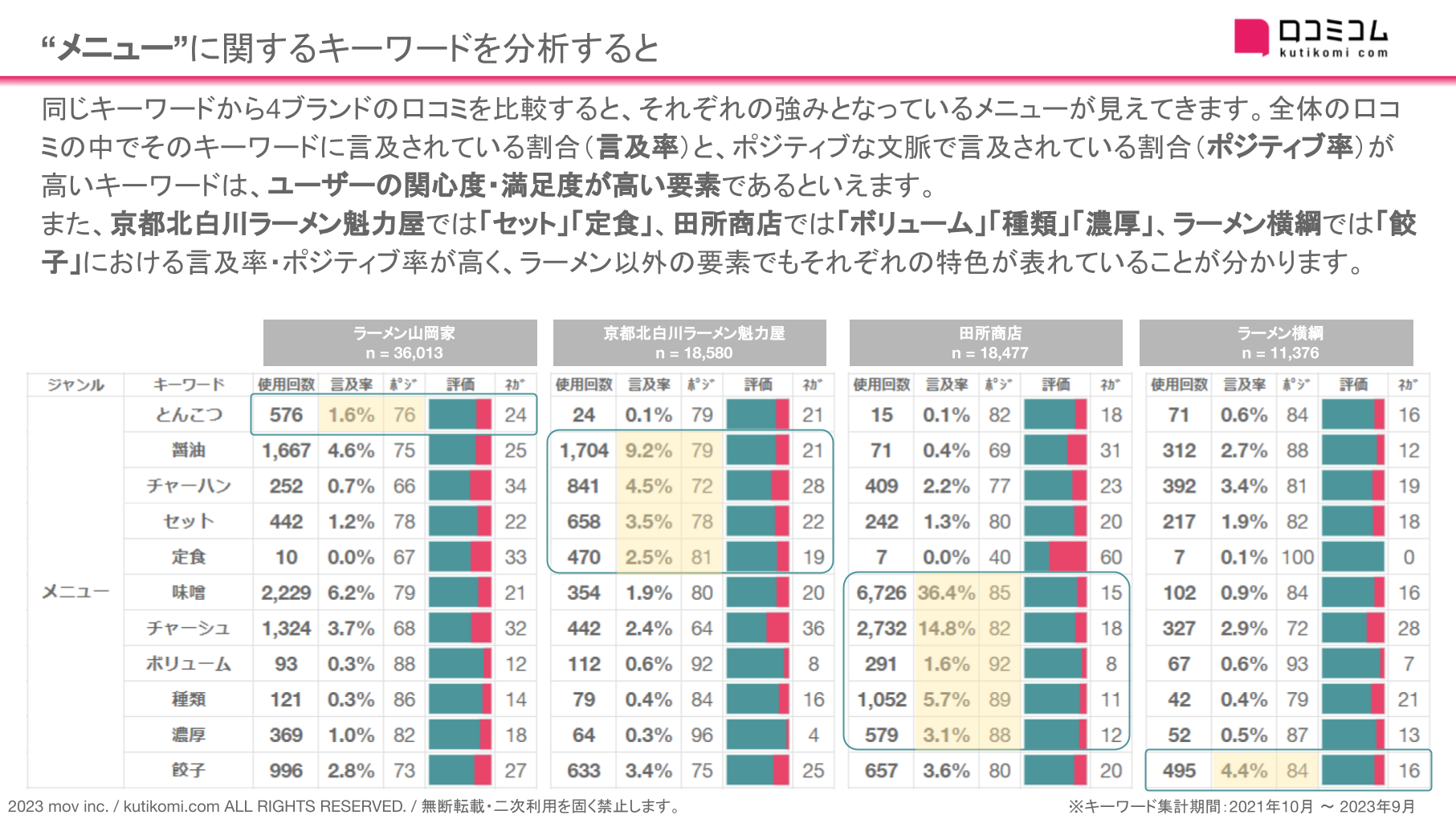 また、京都北白川ラーメン魁力屋では「セット」「定食」、田所商店では「ボリューム」「種類」「濃厚」、ラーメン横綱では「餃子」における言及率・ポジティブ率が高く、ラーメン以外の要素でもそれぞれの特色が表れていることが分かります。