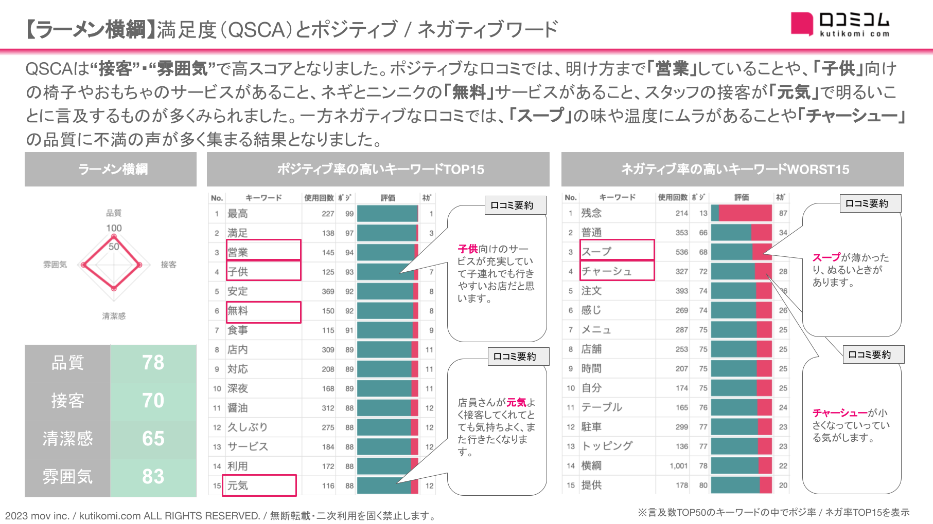 QSCAは“接客”・“雰囲気”で高スコアとなりました。ポジティブな口コミでは、明け方まで「営業」していることや、「子供」向けの椅子やおもちゃのサービスがあること、ネギとニンニクの「無料」サービスがあること、スタッフの接客が「元気」で明るいことに言及するものが多くみられました。一方ネガティブな口コミでは、「スープ」の味や温度にムラがあることや「チャーシュー」の品質に不満の声が多く集まる結果となりました。