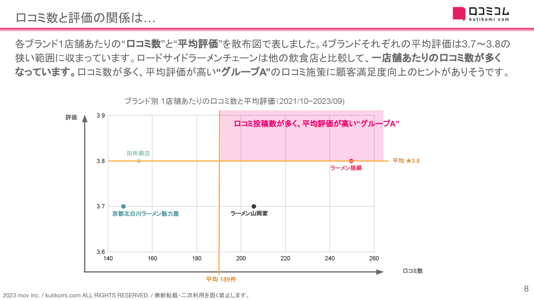 各ブランド1店舗あたりの“口コミ数”と“平均評価”を散布図で表しました。4ブランドそれぞれの平均評価は3.7~3.8の狭い範囲に収まっています。ロードサイドラーメンチェーンは他の飲食店と比較して、一店舗あたりの口コミ数が多くなっています。口コミ数が多く、平均評価が高い“グループA”の口コミ施策に顧客満足度向上のヒントがありそうです。