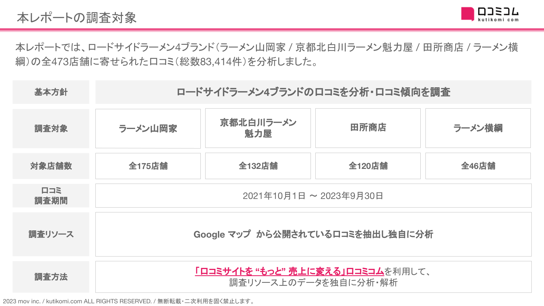今回は、ロードサイドラーメン4ブランド(ラーメン山岡家 / 京都北白川ラーメン魁力屋 / 田所商店 / ラーメン横綱)に寄せられた約8.3万件の口コミを調査、比較検証をしました。