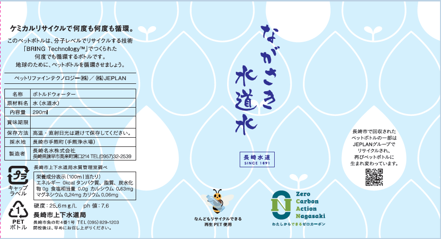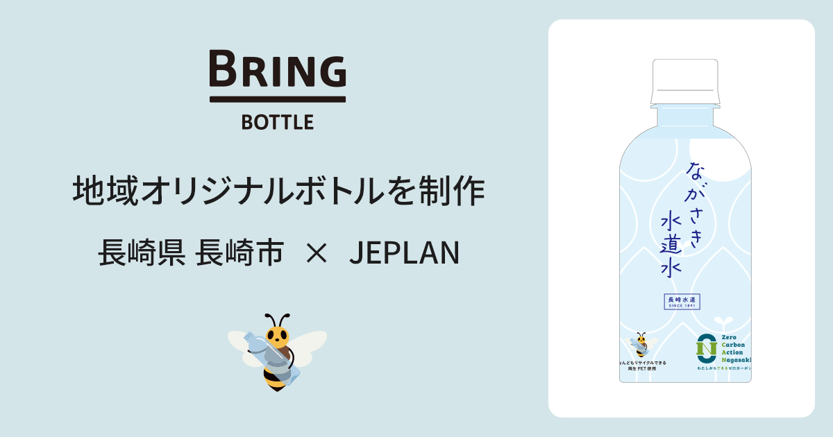本ボトルのラベルには、ゼロカーボンシティの宣言を掲げる長崎市の象徴「Zero Carbon Action Nagasaki」のロゴがあしらわれ、未来に向けた平和への願いをあかるくイメージしたデザインとなっています。またJEPLANの何度でも生まれ変わる循環のシンボルであるハチマークも描かれています。“ながさき水道水”と銘打たれた本製品には、明治時代より給水を開始し「長崎おいしい水の日」を制定するほどのこだわりをもつ“長崎市の水道水”が充填されていて、JEPLANグループが制作するボトルとしては、全国で初めて水道水が充填された地域オリジナルの循環型ボトルになります。なお、本ボトルは、2023年11月に開催されるながさきエコライフ・フェスタでの披露を予定しています。