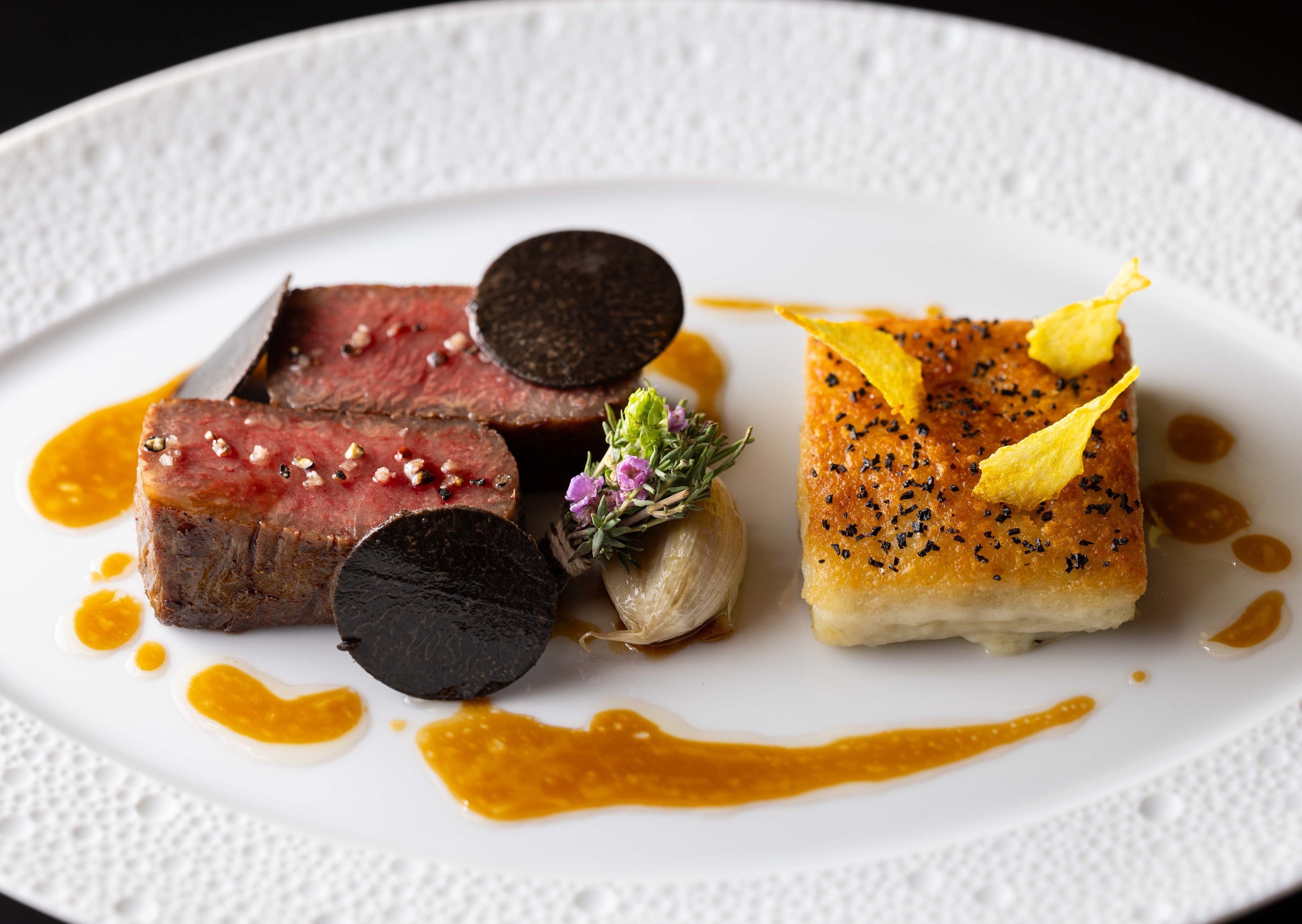 厳選した和牛フィレ肉はクリスマスらしく黒トリュフを使い、リッチに仕上げました。付け合わせには今年20周年を迎えた同店の記念コースでも提供したカンデーレを添えています。