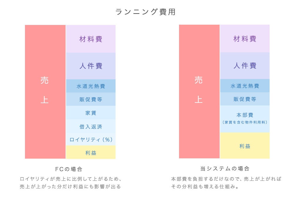 フランチャイズの場合は、ロイヤリティが売上に比例して上がるため、売り上げが上がった分だけ利益にも影響が出ますが、『トラナビ』の場合本部費を負担するだけなので、売り上げが上がればその分利益が増える仕組みになっています。