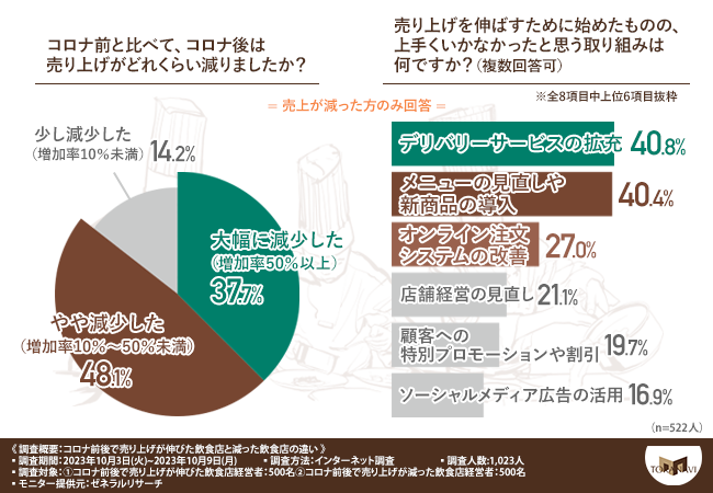 コロナ後に売り上げアップに成功した飲食店では、どんな取り組みが功を奏したのでしょうか。また、売り上げが減った飲食店の経営者にはどんな後悔があるのでしょうか。