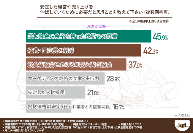 「安定した経営や売り上げを伸ばしていくために必要だと思うことを教えて下さい(複数回答可)」と質問したところ、『運転資金に余裕を持った状態での経営(45.9%)』と回答した方が最も多く、次いで『経費・固定費の削減(42.3%)』『飲食店経営における知識と実践経験(37.0%)』『マーケティング戦略の立案・実行力(28.9%)』『安定した人材採用(21.8%)』『食材価格の安定(仕入れ業者との信頼関係)(16.7%)』と続きました。