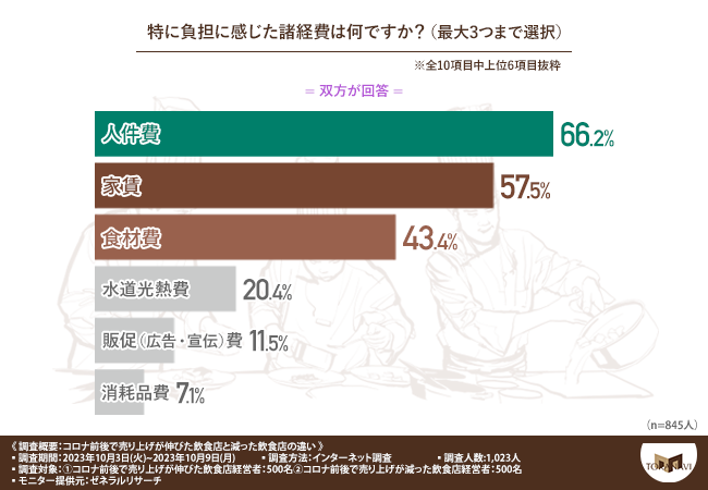 「特に負担に感じた諸経費は何ですか?(上位3項目回答)※最大3つまで選択」と質問したところ、『人件費(66.2%)』と回答した方が最も多く、次いで『家賃(57.5%)』『食材費(43.4%)』『水道光熱費(20.4%)』『販促(広告・宣伝)費(11.5%)』『消耗品費(7.1%)』と続きました。