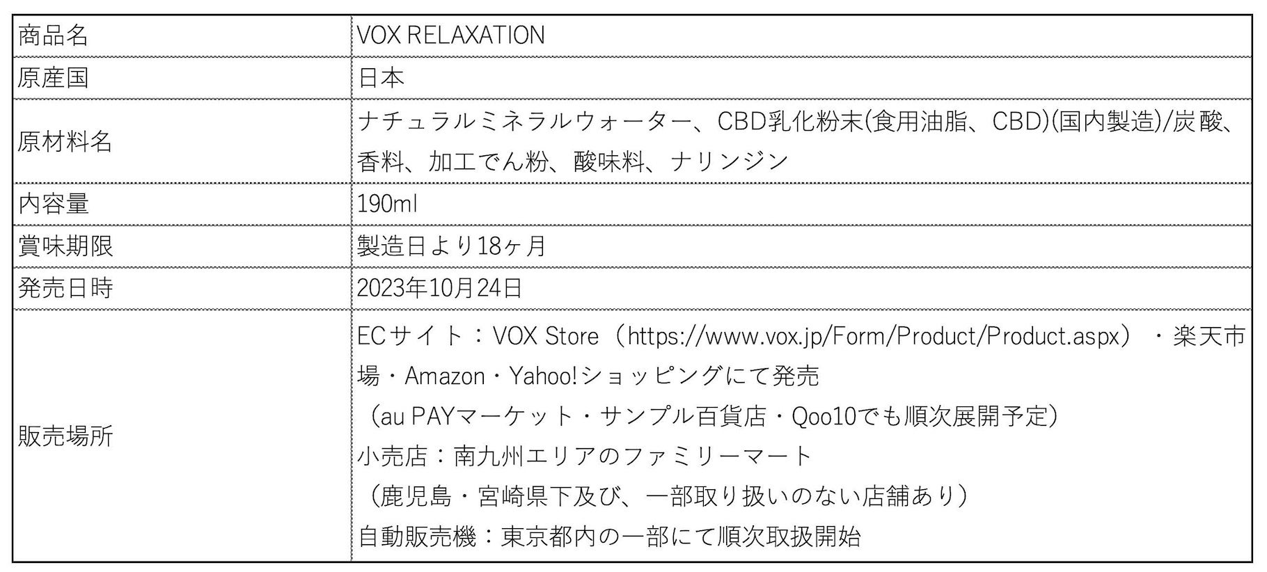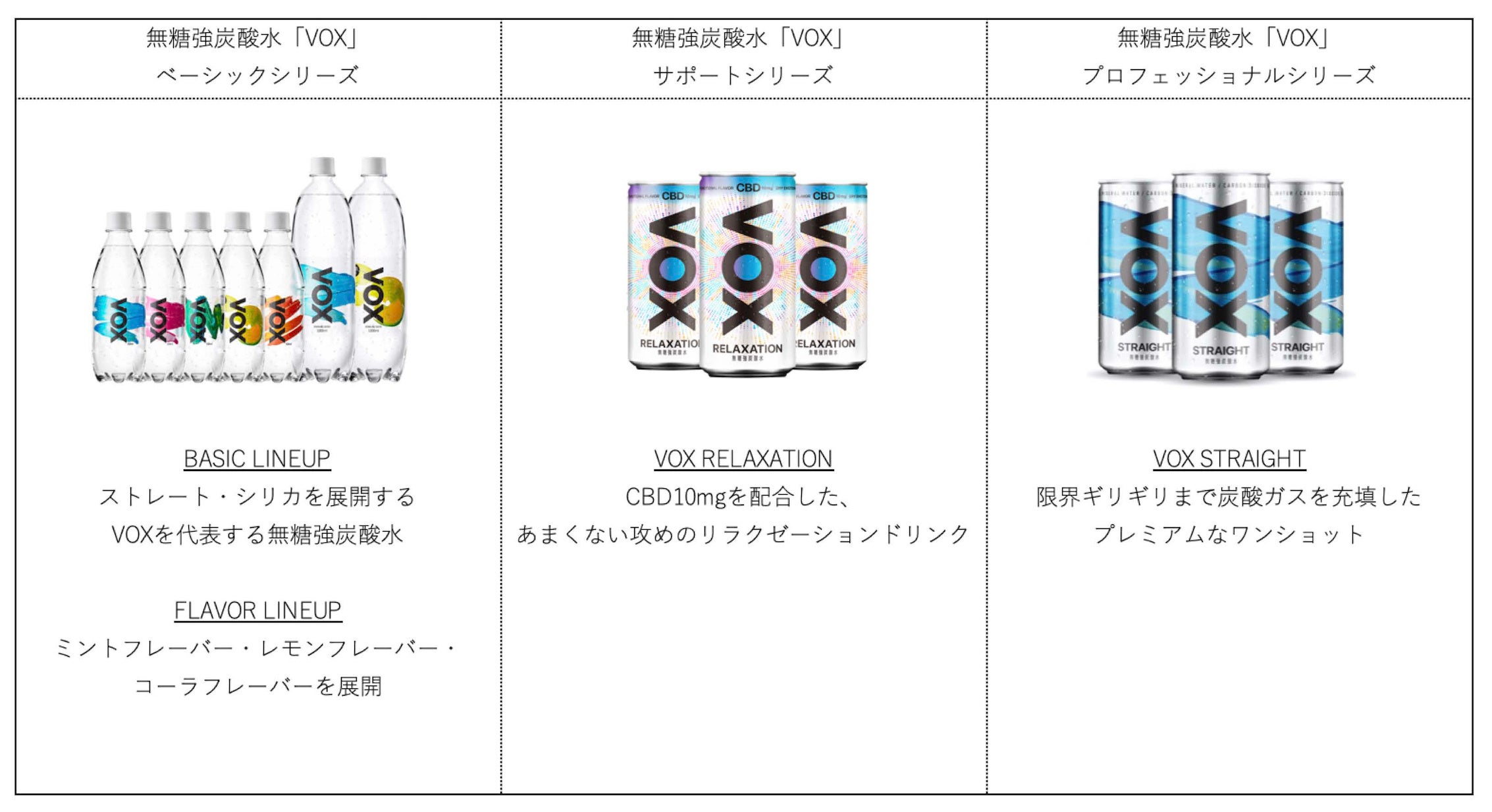 Sports・Music・Fashion・Artの4つのカルチャーを中心とした様々な文化とともに共創する炭酸総合ブランドVOXでは、5つのラインアップを展開するベーシックシリーズと、限界ギリギリまで炭酸ガスを充填したアルミ缶タイプのプロフェッショナルシリーズをこれまでに販売。10月24日よりサポートシリーズの第一弾としてローンチするVOX RELAXATIONは、「CHANGE YOUR LIFE」をブランドメッセージに掲げる VOXの世界観を一層広げます。