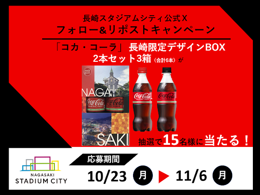 長崎スタジアムシティ公式X(旧Twitter)より発信する投稿を「フォロー&リポスト」いただくと、抽選で15名様に「『コカ・コーラ』[NK(紘1] 長崎限定デザインBOX」3箱、合計6本をプレゼントいたします!BOXには、「コカ・コーラ 500ml PET」と「コカ・コーラ ゼロ500ml PET」[KM(真2] の計2本が入っています。