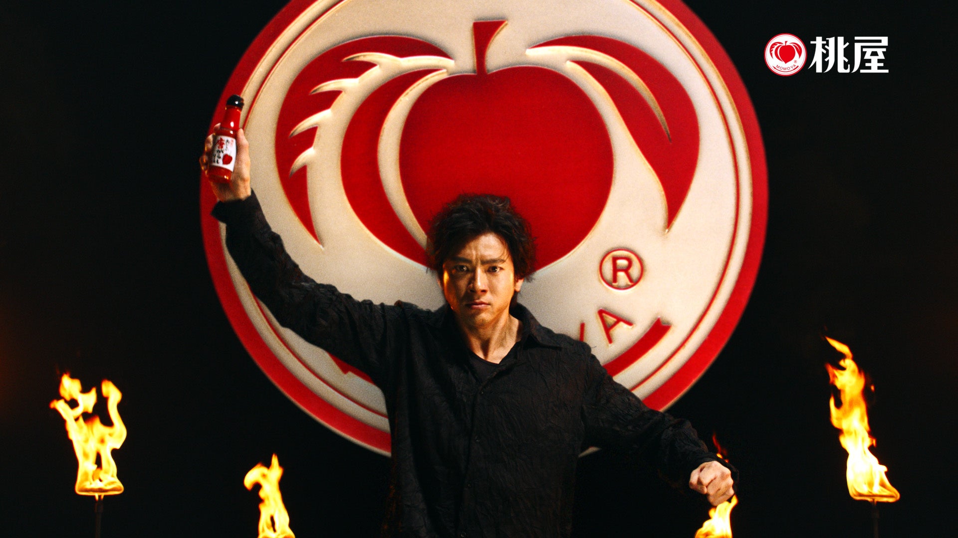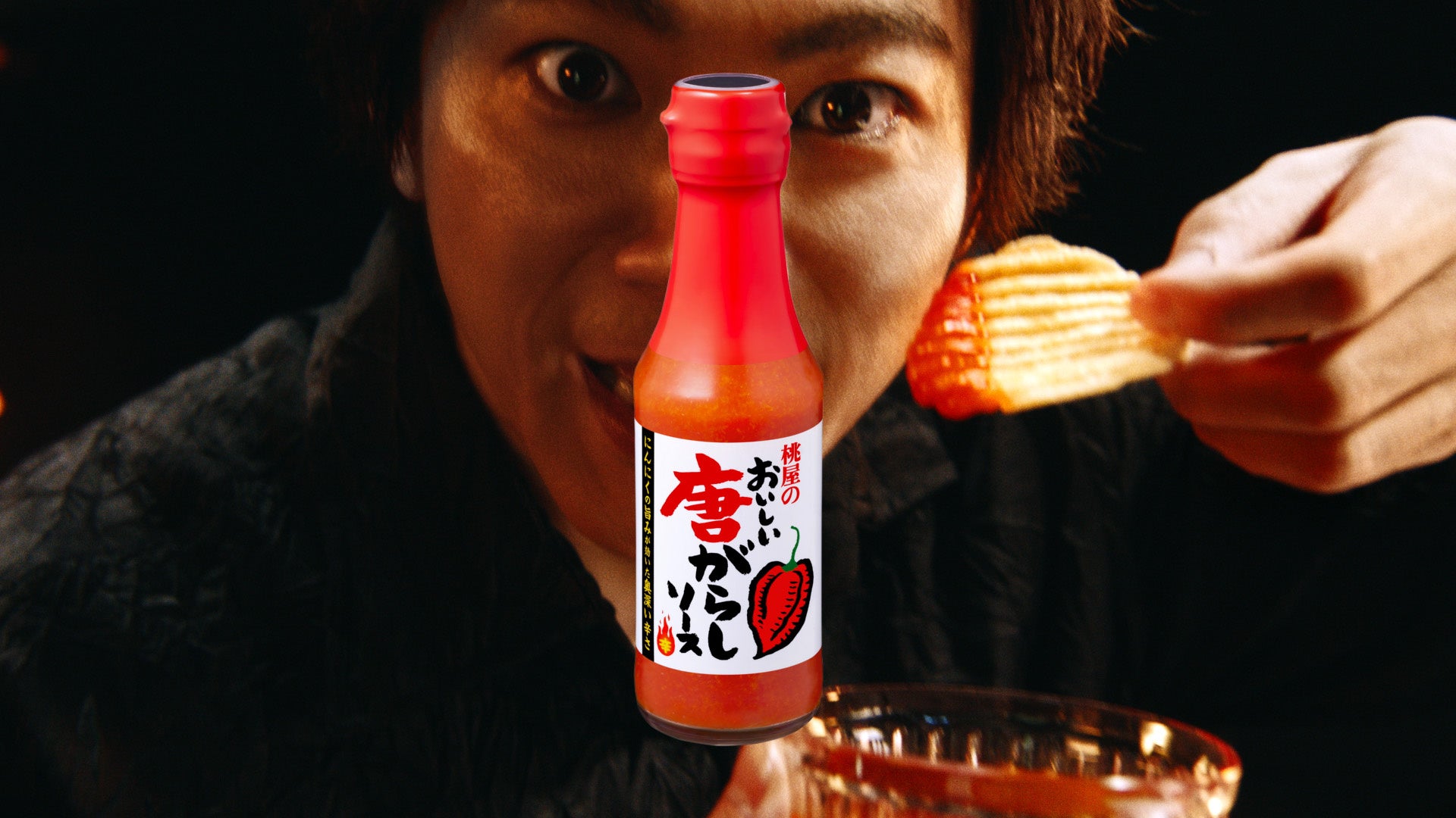 CMは「おいしい唐がらしソース」を手にした山田さんが、「日本の!辛味ソースの!ど真ん中ー!!」と力強く宣言&ポーズを決める姿から始まります。その宣言と呼応するように映し出されるのは、黒い空間に浮かぶ炎と堂々たる「桃屋」のロゴマークです。