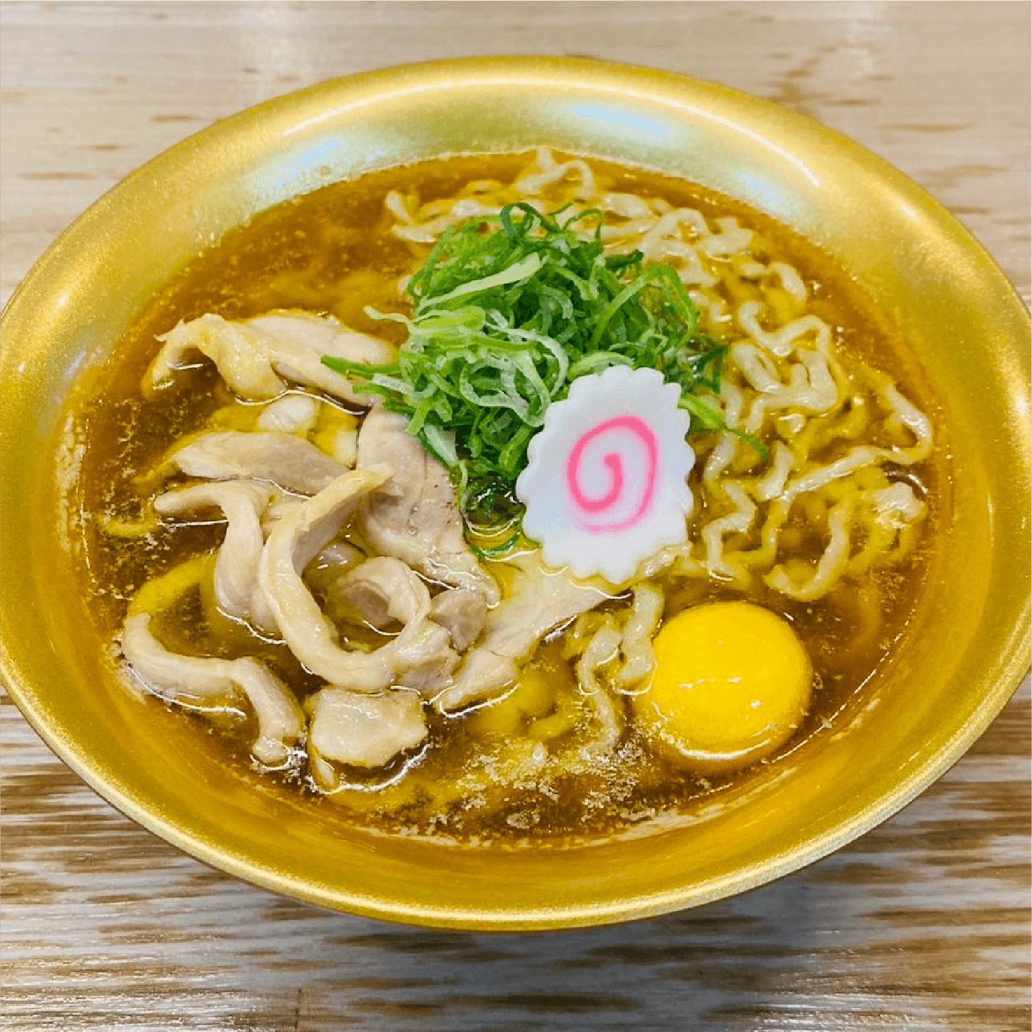 黄金に輝く、まるごと鶏が味わえる一杯!麺は山形特有太ちぢれ多加水麺!