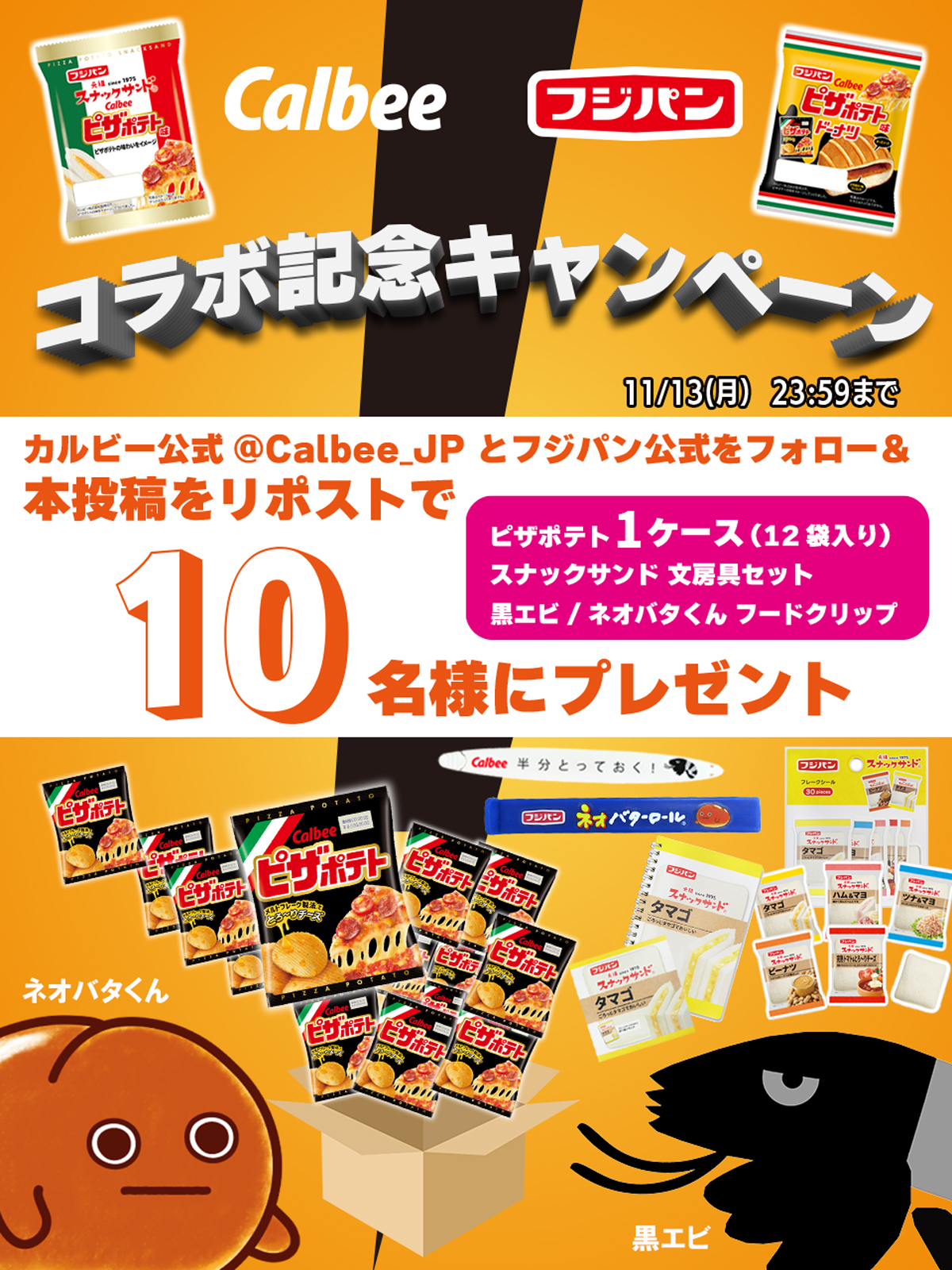 キャンペーン開催期間中、フジパン公式X(旧Twitter)とカルビー公式X(旧Twitter)をフォローし、キャンペーン投稿をリツイートすると抽選で10名様にピザポテト1ケース、黒エビフードクリップとフジパンオリジナルグッズをプレゼントします。キャンペーンへのご参加をお待ちしております。