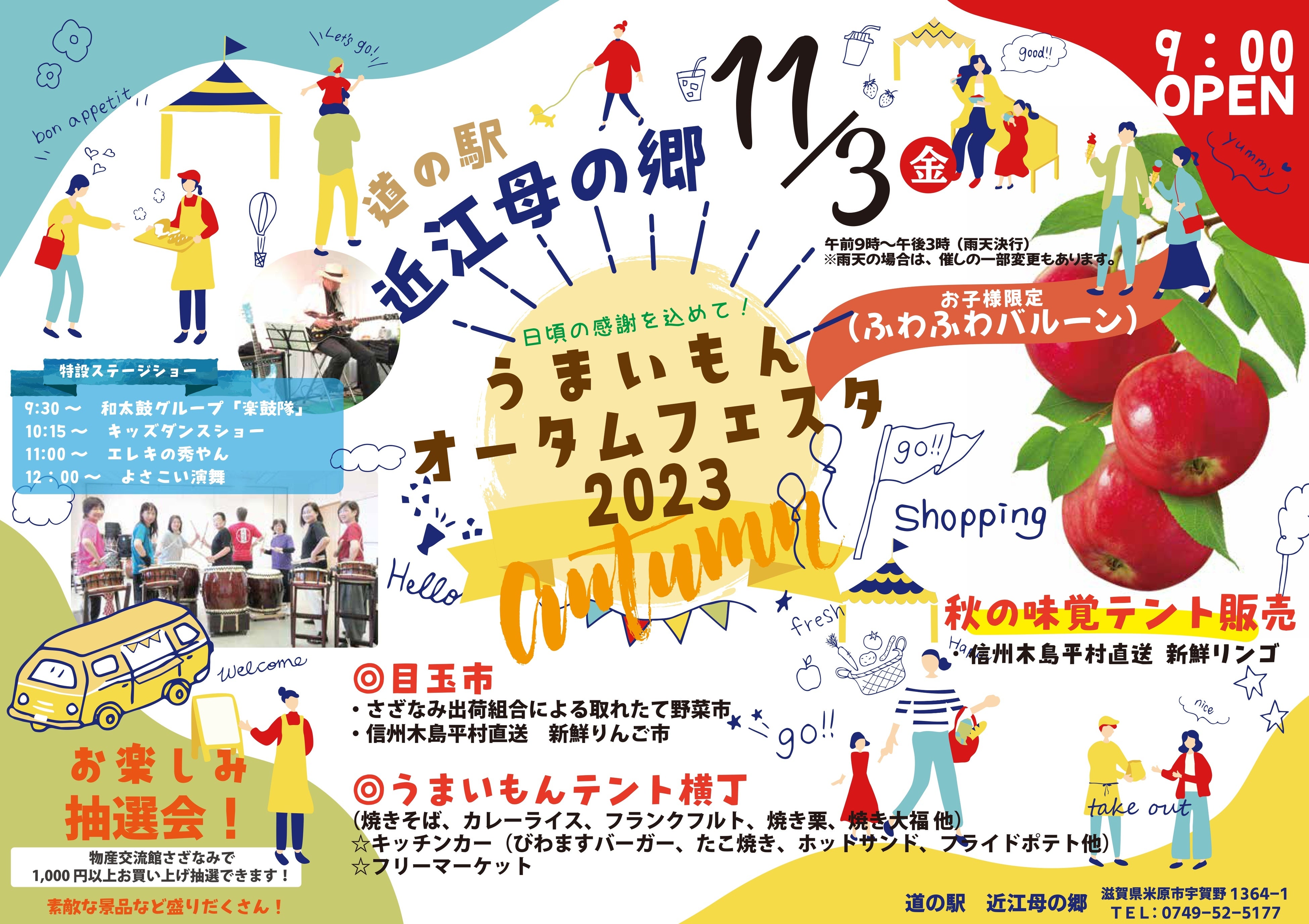 秋の味覚が揃うこの季節、11月3日(金)に「近江母の郷うまいもんオータムフェスタ2023」を滋賀県米原市の「道の駅 近江母の郷」(http://www.omihahanosato.jp/)にて開催。「秋の味覚テント販売」ではりんご「2000個」やシャインマスカット「200パック」を用意する他、「キッチンカー」、「うまいもんテント横丁」、「子供たちが遊べる遊具」を設置。また、特設ステージショーとして和太鼓や吹奏楽を中心とした「音楽演奏」や「よさこい演舞」、豪華賞品が当たる「大抽選会」なども予定しています。