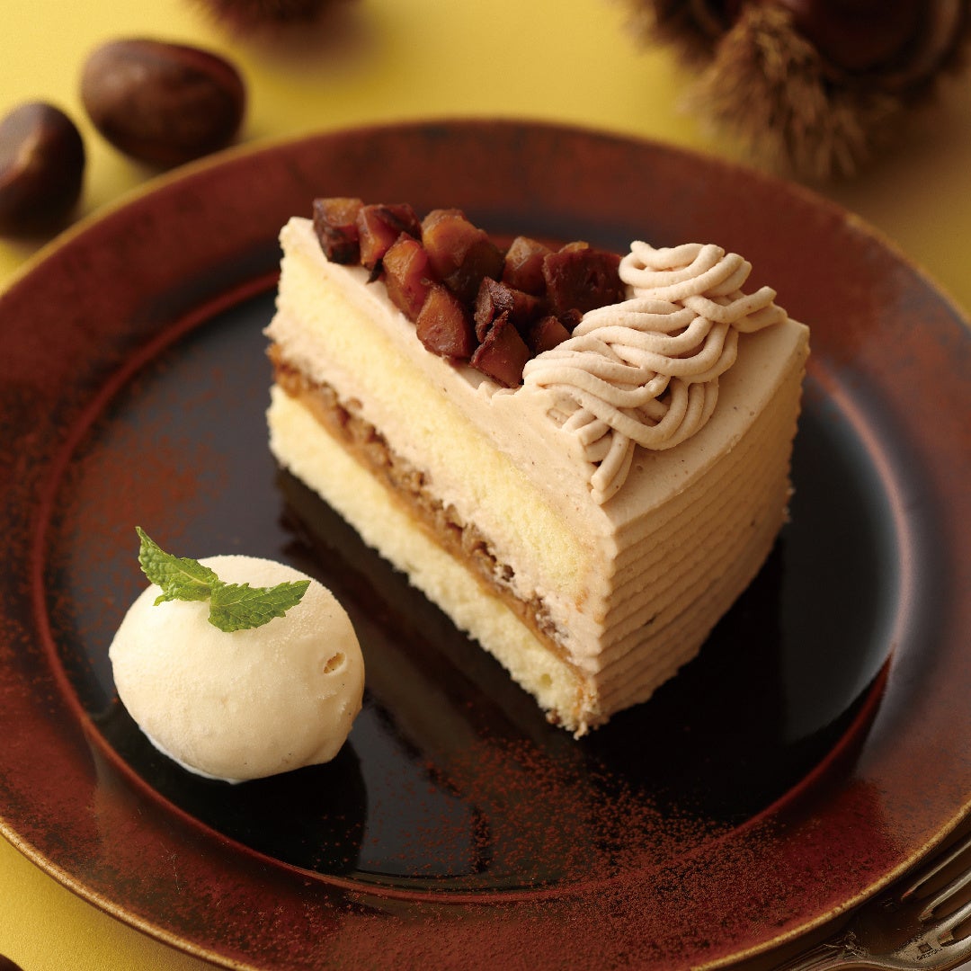 しっとり焼き上げたスポンジと、マロンカスタードとマロン・シャンティの2種クリーム、栗の甘露煮をかさねた贅沢な味わいです。