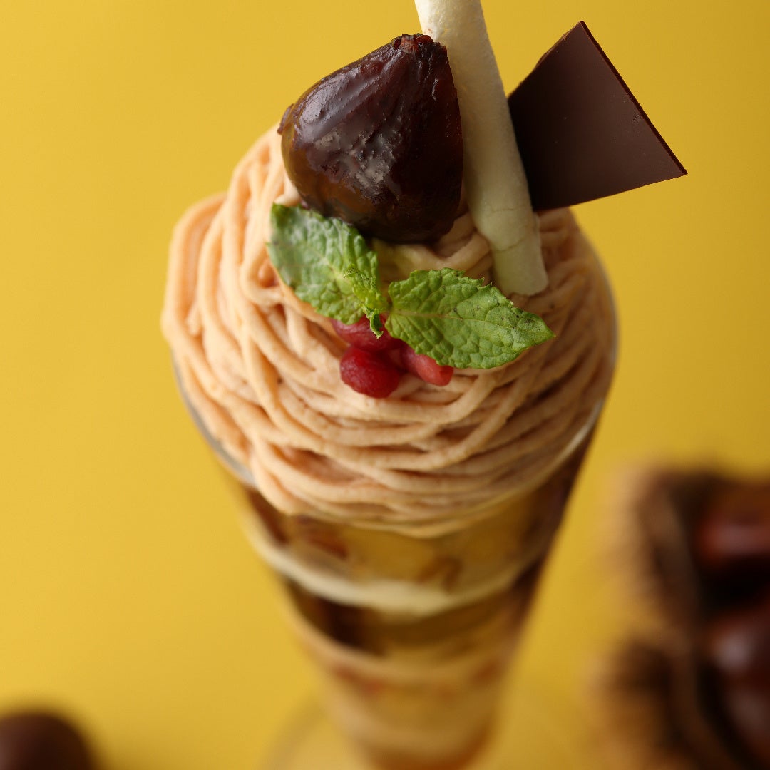 程良い甘さのマロンクリーム、コーヒーゼリー、栗の甘露煮とザクロ、クレーム・シャンティを6層仕立てに、バニラアイスを合わせたモンブランパフェ。
