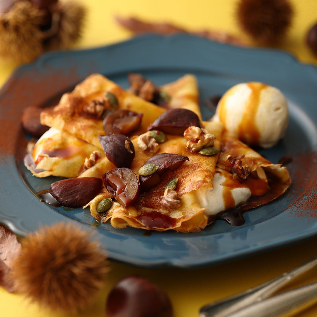 焦がしバターを加えて焼いた自家製クレープに、マロンクリームを包みました。渋皮栗、ザクザク食感のナッツ、カラメルソースとご一緒に。