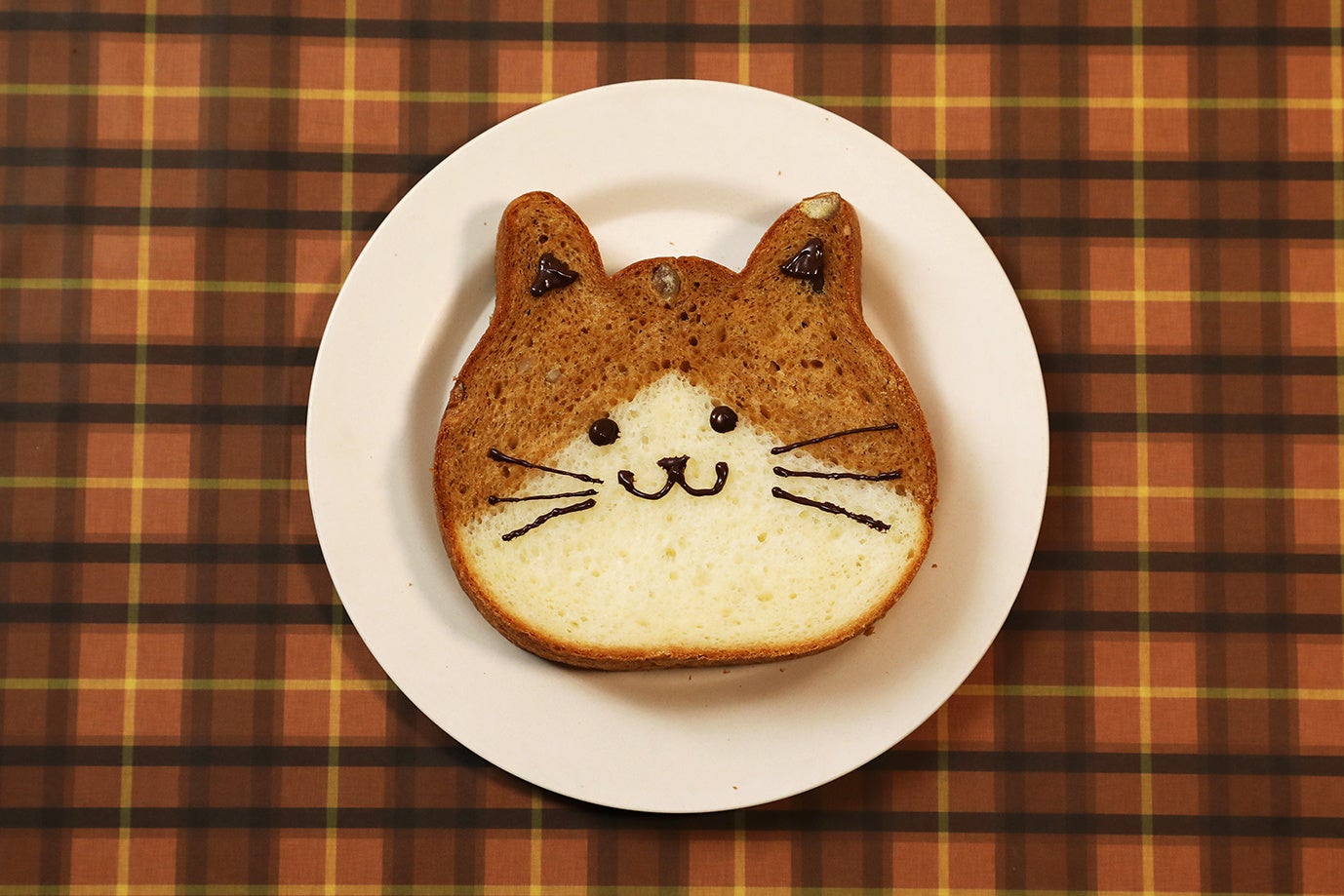 甘栗かのこ入りの栗香るマロン生地と、ミルクの旨味が感じられるプレーン生地を合わせて”はちわれ”模様を表現したねこねこ食パンです。ミルク100%の優しい味わいにほっこりとした栗の甘みと食感がアクセント。そのままお召し上がりいただくのはもちろん、チョコペンでお顔を描いたりデコレーションいただくのもお楽しみいただけます。