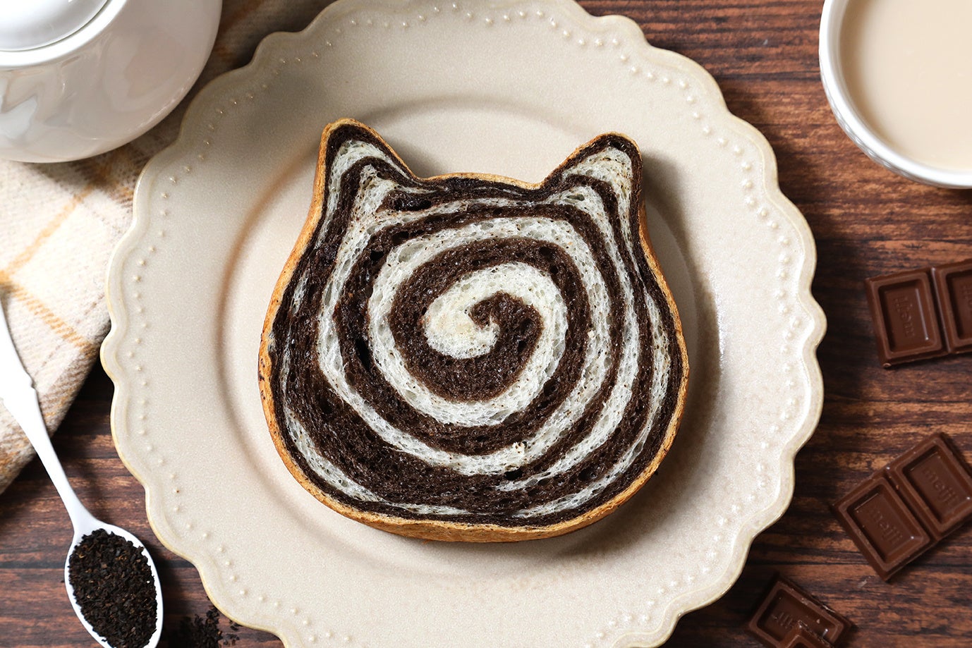 アールグレイの茶葉を練り込んだ紅茶生地と、チョコチップ入りのチョコ生地をぐるぐると巻いて焼き上げました。アールグレイの爽やかな柑橘の風味がチョコのコクを引き立てるねこねこ食パンです。ほっと落ち着いた気持ちにさせてくれるねこねこ食パンで、冬のはじまりをお楽しみください。