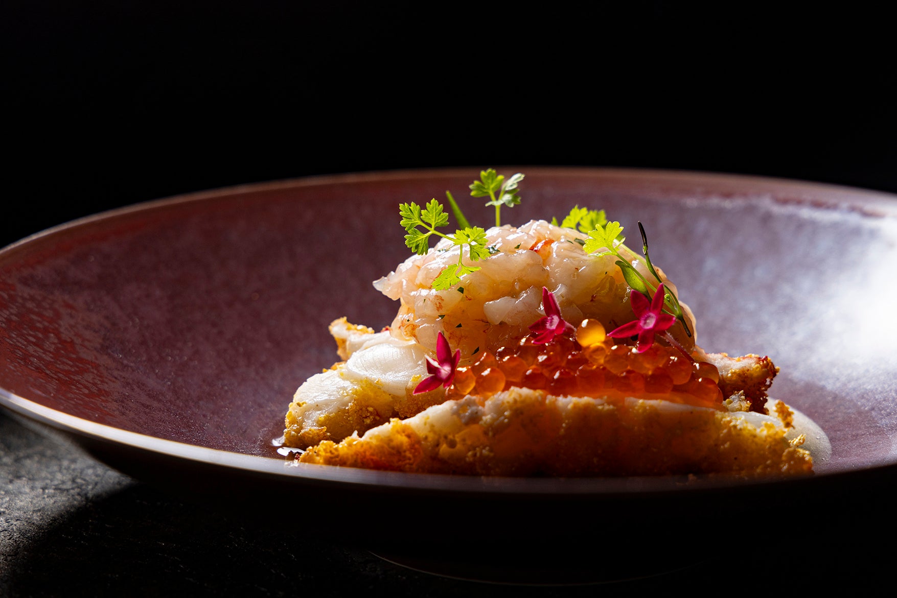 オマールエビのふっくらとしたテールを一本贅沢に使用したフリットに、いくらと、オリーブオイルとレモンでシンプルに味付けされた甘えびのタルタルを添えています。あたたかなオマール海老のコンソメスープに、旨味をまとったホワイトアスパラガスの食感が合わさる、海の幸が凝縮された一皿です。