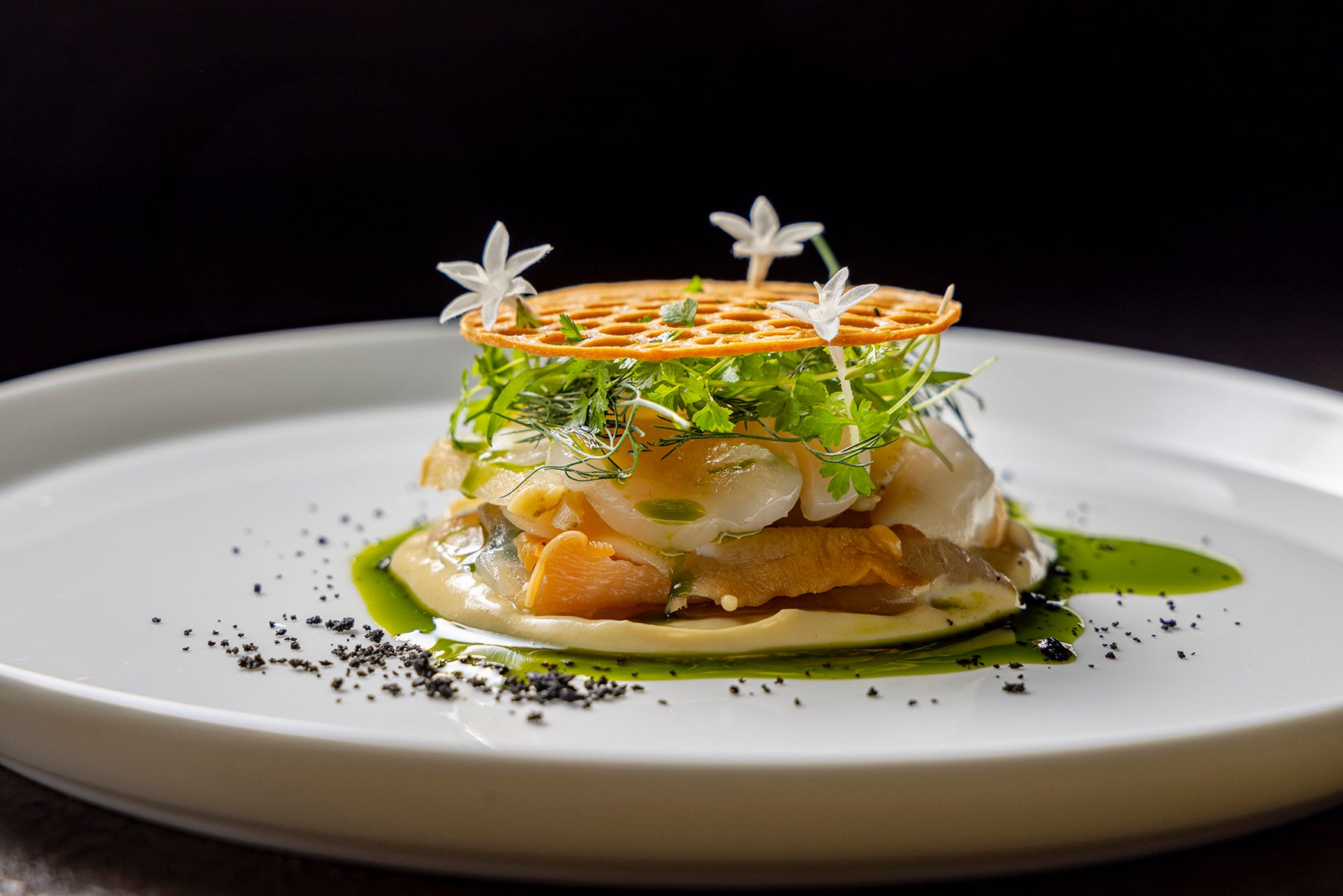 まるでチーズのような深いコクのクリーミーなソースが白身魚や貝と絶妙に絡み合う一皿です。欧米で人気が出ている栄養豊富なスーパーフード、ニュートリショナルイースト(酵母)を使ったヌーチソースは、旨味たっぷりの濃密な風味。カシューナッツとガーリックの香ばしさがアクセントに。昆布締めし身がしまって、程よい歯ごたえの新鮮なアワビやホタテとヌーチソースの相性は抜群です。自家製パルメザンチーズのチュイールを添え、イカ墨のクランブルとハーブのオイルで香り付けされています。