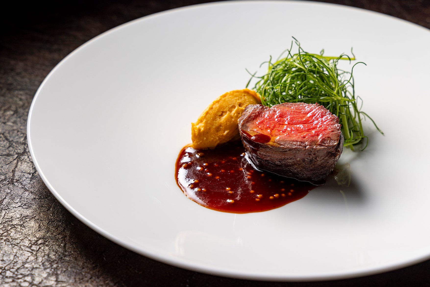 柔らかく濃厚な肉本来の旨みが口の中で広がる至高の一皿。程よく引き締まった赤身のリブアイステーキに、ソースと雲丹バターをまとわせた一口は極上の味わいです。グラスフェッドビーフ(牧草飼育牛肉)の最高峰「パスチャーフェッド」は、広大な牧草地でストレスフリーに放牧され、播種から行い育てられた牧草をたっぷりと食べて育ちます。アニマルウェルフェアに基づき飼育され、配合飼料や成長ホルモン剤は生涯不使用。真の贅沢をご体感ください。