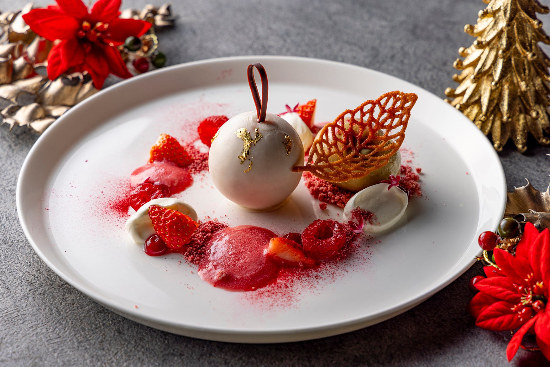 クリスマスのオーナメントをオマージュしたストロベリームースで、甘く、心温まる時間をお過ごしください。ラズベリーのジュレが包み込まれたムースにはラズベリーとライチのエスプーマ、マスカルポーネのクリーム、ピスタチオのジェラートを添えています。
