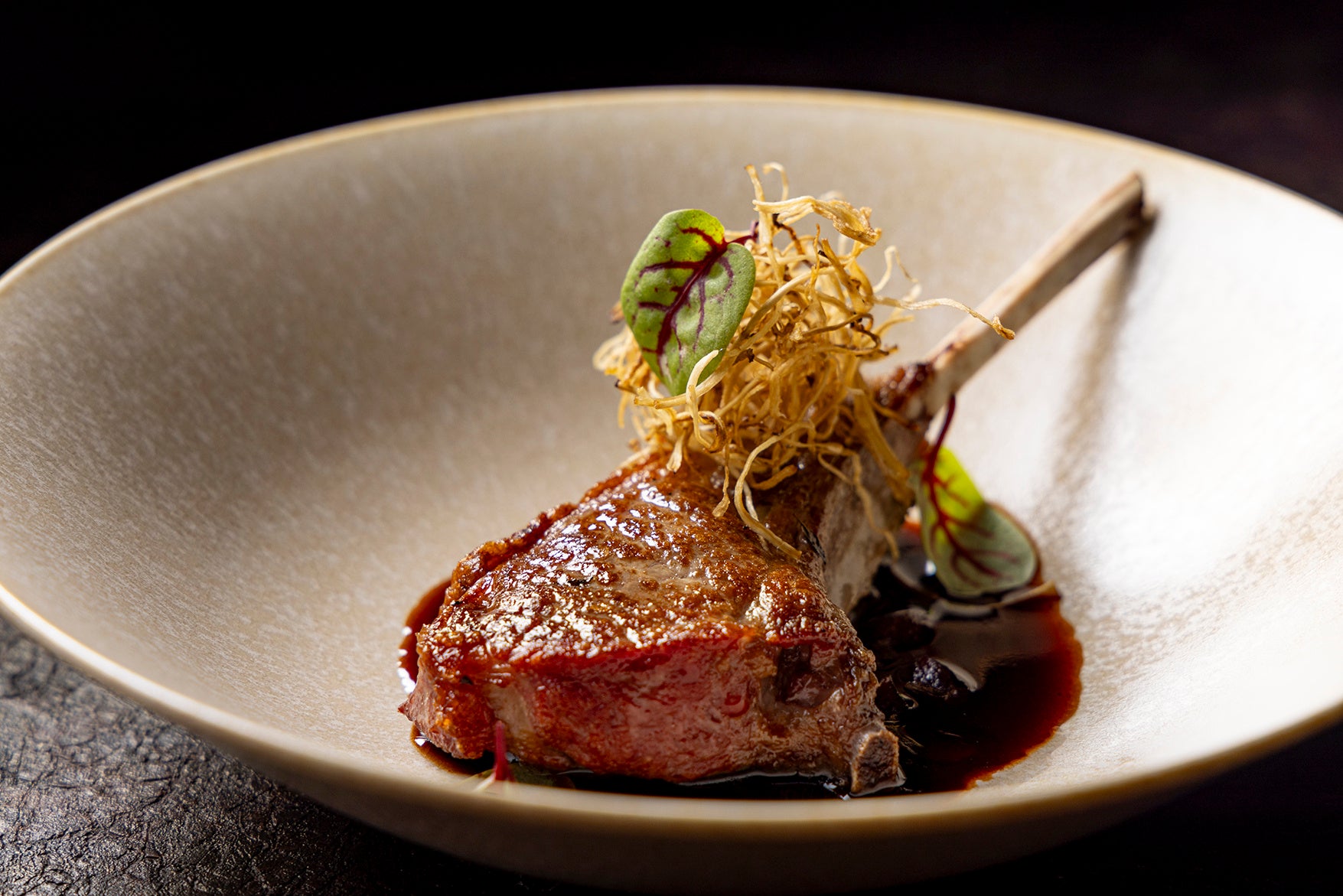 AUS産ラムチョップのロースト ごぼうのフリット ポルチーニ トリュフソース