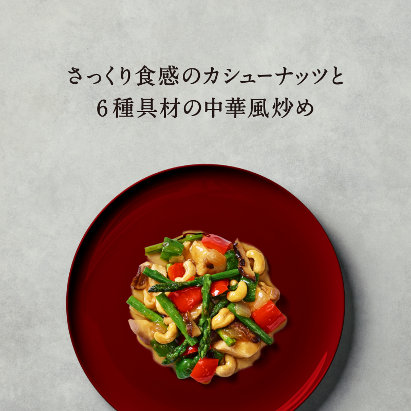 心弾むような赤と緑の彩り。 とろみに、うま味を閉じ込めた中華風の味わいです。大きめカットの具材たちは、味や栄養はもちろん、 かみごたえも満点。さらにカシューナッツも贅沢に入っているため、 満足感もあります。