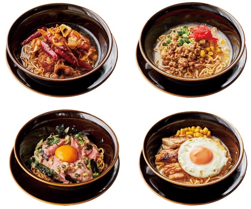 ①ブタメンしょうゆ味 × ネギたっぷりピリ辛海老ラーメン ¥ 446 ( 税込¥490)※画像左上