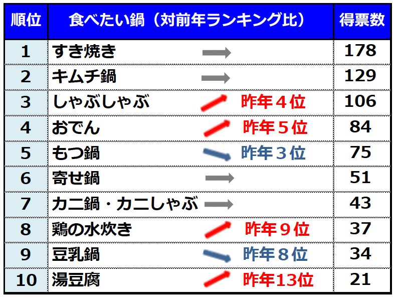 大きくランクアップしたのは10位の「湯豆腐」。昨年13位から上昇しTOP10内に入りました。「ヘルシーでおいしい」「ダイエットしつつおいしく食べられるので」などのコメントが寄せられました。
