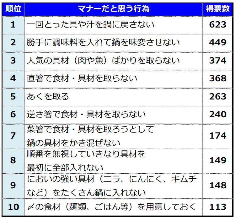 ■複数人で鍋をするときの「マナー」味の好みに関するマナーが多くランクイン