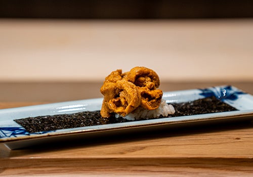 北海道産の生雲丹をたっぷりと。海苔で巻いてお召し上がりいただきます。