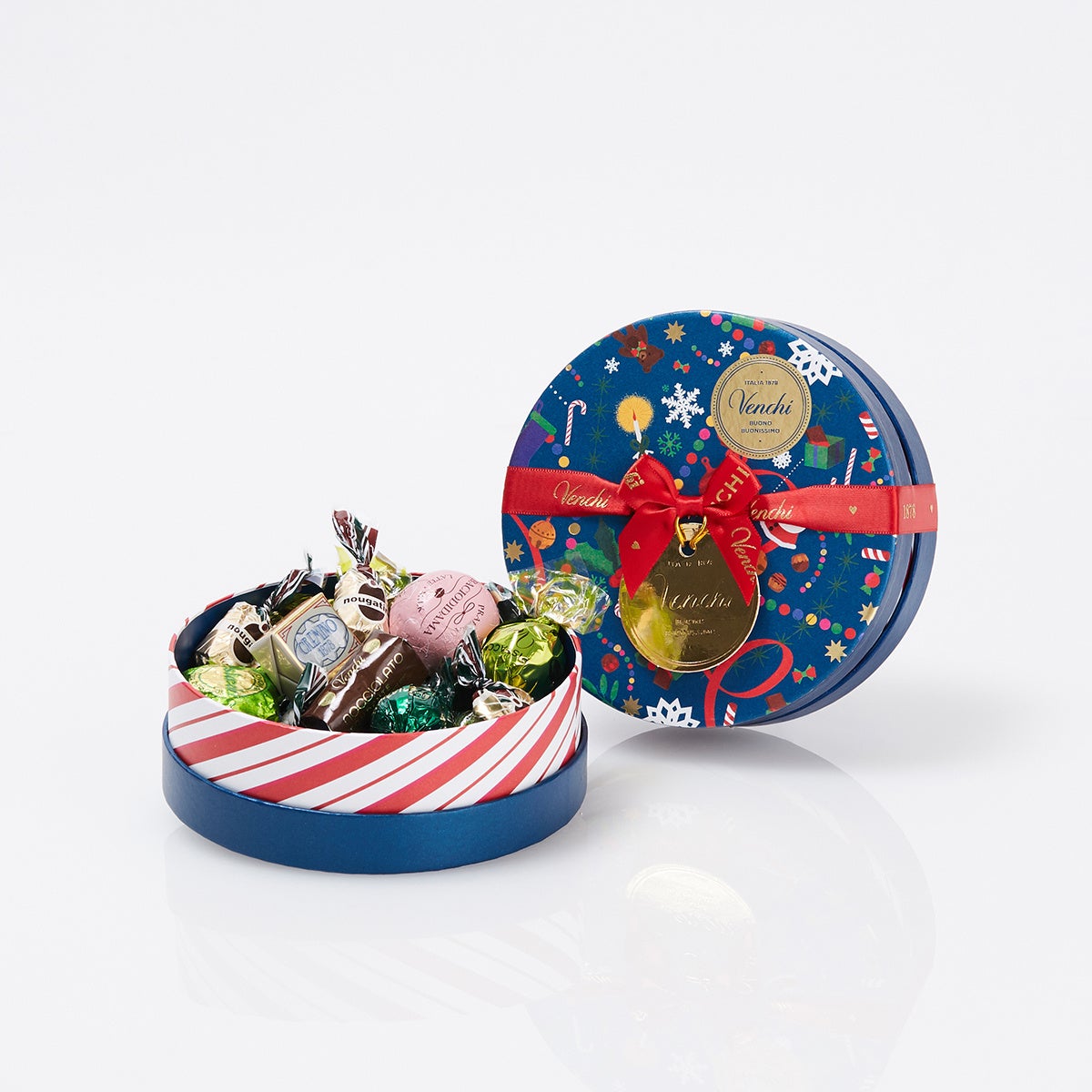 クラシカルな印象のスクエア型のギフトボックス。クリスマスモチーフを散りばめてツリーをデザインした深い青のギフトボックスにはジャンドゥイオット4種類、リースを施した赤いギフトボックスには、ヴェンキを代表するチョコレート「チョコビア」4種が詰まっています。