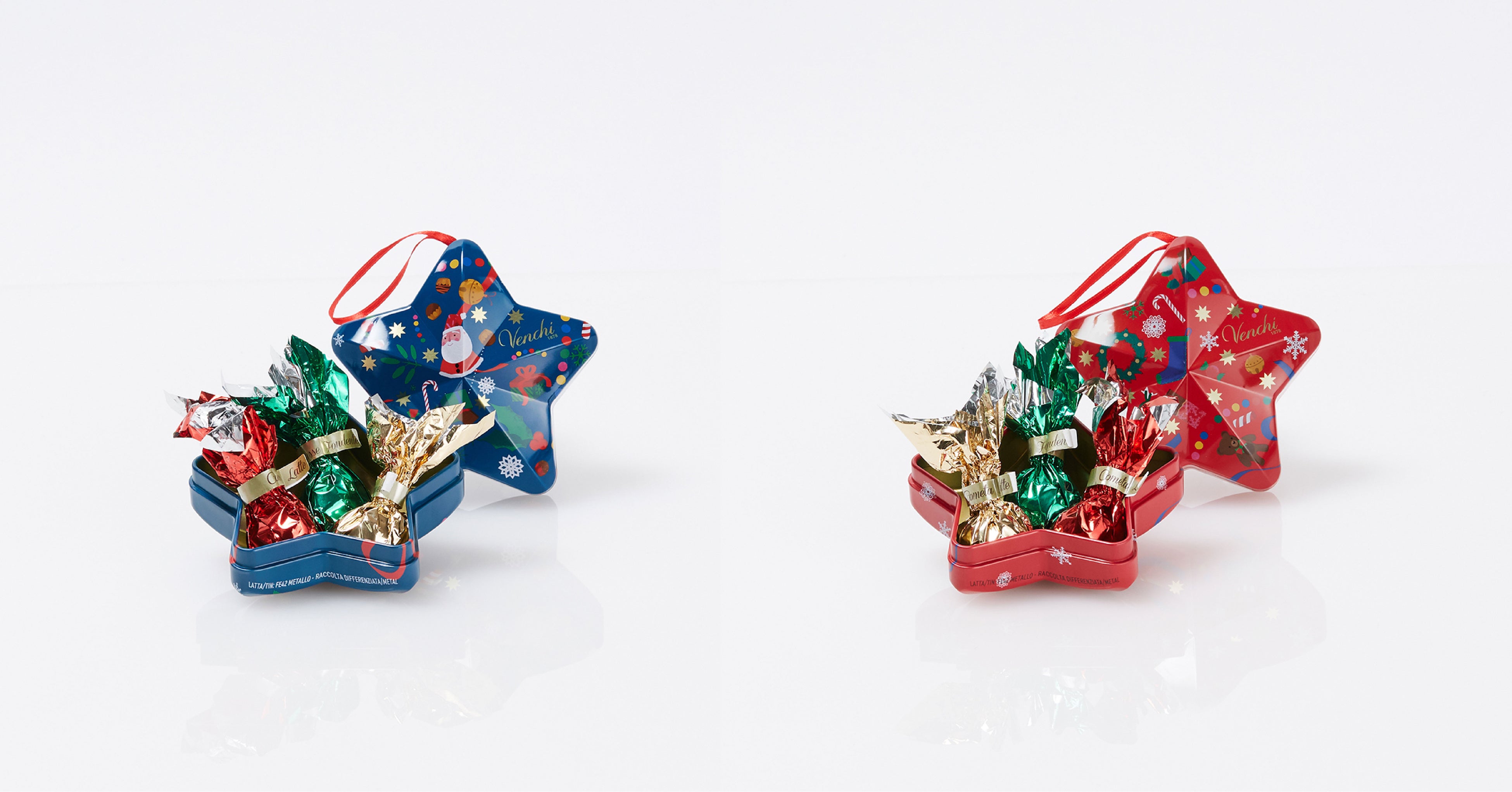 星形の缶のオーナメント。彗星をイメージしたきらきらとしたラッパーに包まれたチョコレート「コメッツ」が3色入っています。クリスマスツリーに飾ってお楽しみいただけます。