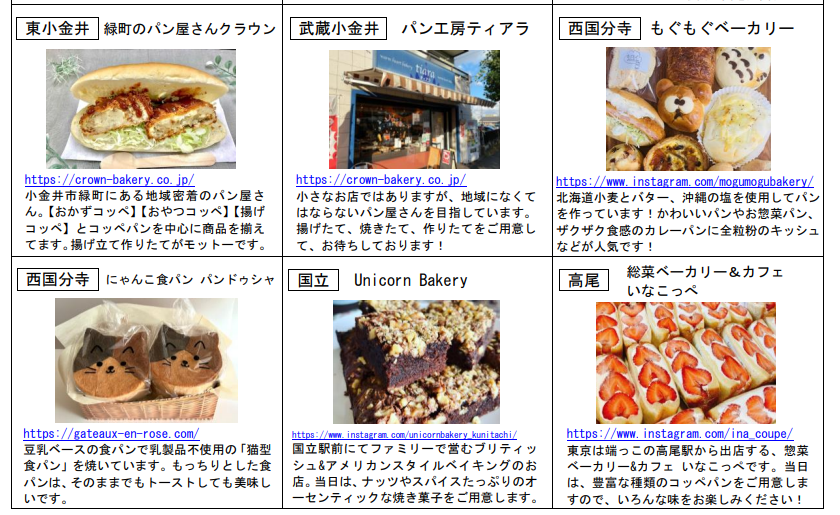 ■開催日時: 2023 年 11 月 11 日(土)・12 日(日) 10:00~17:00 ※小雨決行・荒天中止 ■開催場所: 【武蔵境会場】武蔵境 nonowa Terrace (武蔵境駅南口よりすぐ) 【東小金井会場】コミュニティステーション東小金井 (東小金井駅北口より徒歩 3 分) ■入場料:無料 ■購入方法: パンお買いもの回数券、または店舗毎の購入 ※回数券は EC 販売のみの取扱いとなります(当日販売なし)。 ※店舗毎にお取り扱いできる決済方法が異なります。 ■公式ページ:https://chuosuki.jp/event2/chuo_pan/ ■出店ショップ:さくらやま果房(中野)/ boulangerie ECLIN(高円寺)/ 天然酵母パンの happyDELI(西荻窪)/ すずめベーカリー(吉祥寺)/ ドイツパンの店リンデ(吉祥寺)/ Mi ジャム(三鷹)/ ブロート・オーフェン(武蔵境)/ ハースブラウン武蔵境店(武蔵境)/ クラウンベーカリー武蔵境(武蔵境)/ 緑町のパン屋さんクラウン(東小金井)/ パン工房ティアラ(武蔵小金井)/ もぐもぐベーカリー(西国分寺)/ にゃんこ食パン パンドゥシャ(西国分寺)/ Unicorn Bakery(国立)/ 総菜ベーカリー&カフェ いなこっぺ(高尾)/ 菓子工房なつの(小平市)/ Amori(西東京市)/ ベーカリーハウスマイ(東久留米市)/ Q&D(町田市)/ TOKYO CAMP(中央区)/ coco cherie ※出店ショップは追加・変更となる場合がございます。 |