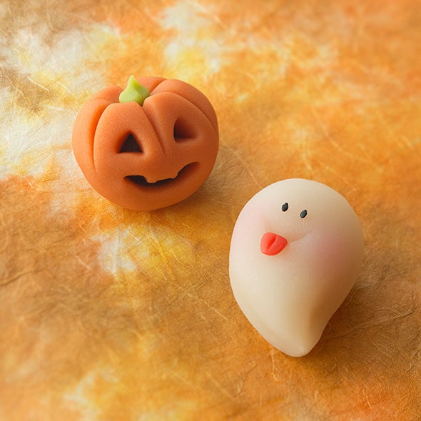 和菓子でもハッピーハロウィン。こなし製のパンプキンと外郎(ういろう)製のゴーストの2種類。