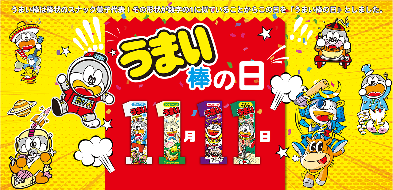 うまい棒は棒状のスナック菓子であり、その形状が数字の“1”に似ていることからこの日をうまい棒の記念日としました。記念日に合わせ弊社では、様々なキャンペーンを実施しております。