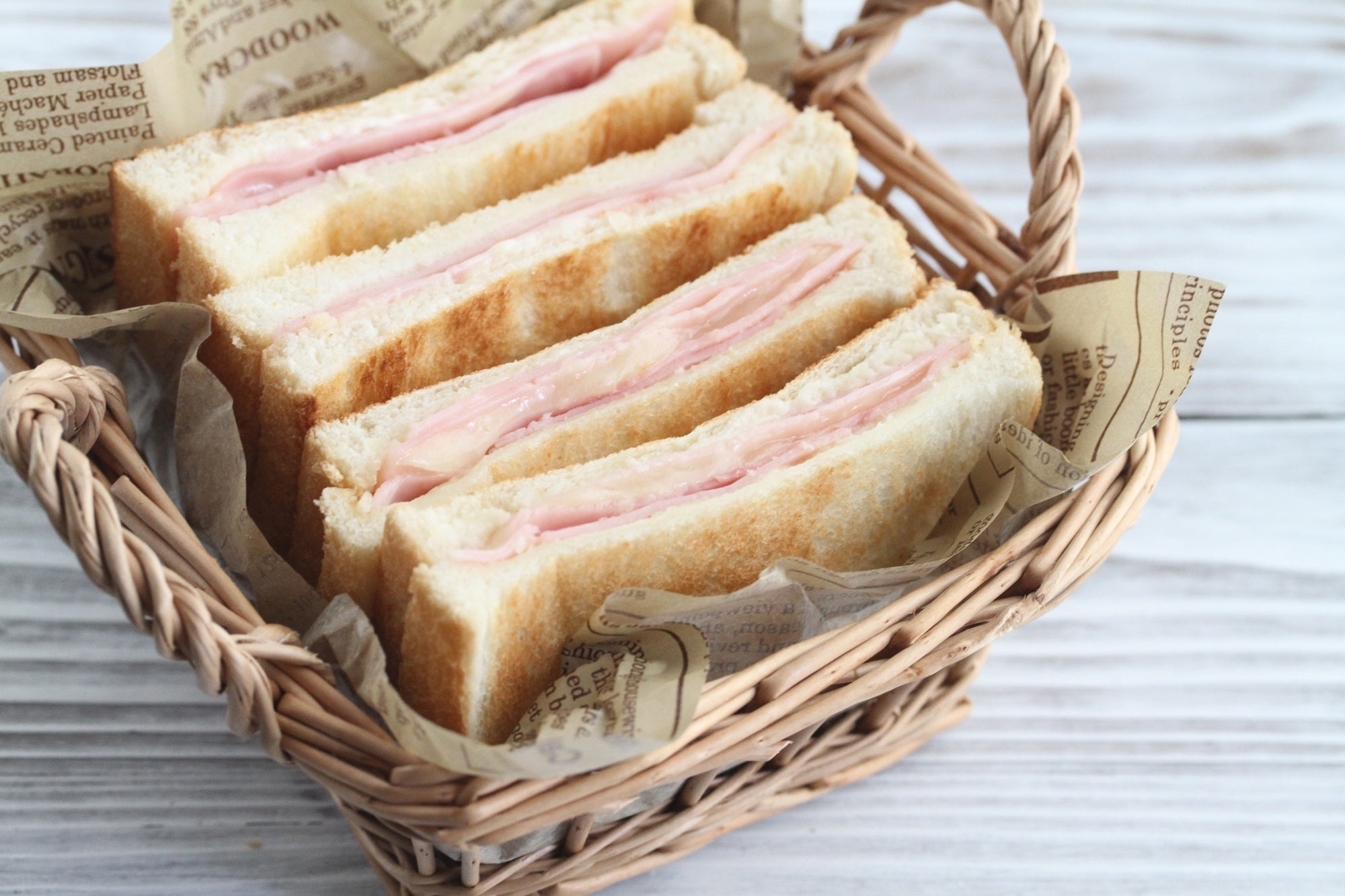 (1)食パン2枚の片面に「ピュアセレクト®マヨネーズ」を大さじ1/2ずつ塗る。食パン1枚にハム、チーズ、ハムそれぞれ2枚ずつを順にのせ、食パン1枚ではさむ。同様にもう1つ作り、それぞれアルミホイルに包む。