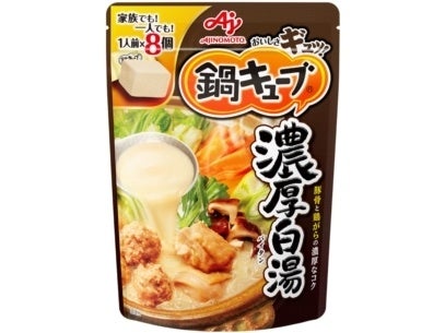 「鍋キューブ® 」は、キューブ1個で1人前なので、一人鍋から大人数の鍋まで入れる個数によって味の濃さや作る量をお好みに調整できる鍋つゆの素です。<濃厚白湯>は、豚骨と鶏がらのだしをベースにした濃厚で深い味わいの、白湯鍋つゆの素です。しょうが・にんにくなどの香味野菜とかつお風味を隠し味としてきかせることで、食欲をそそるコク深い味わいに仕上げました。