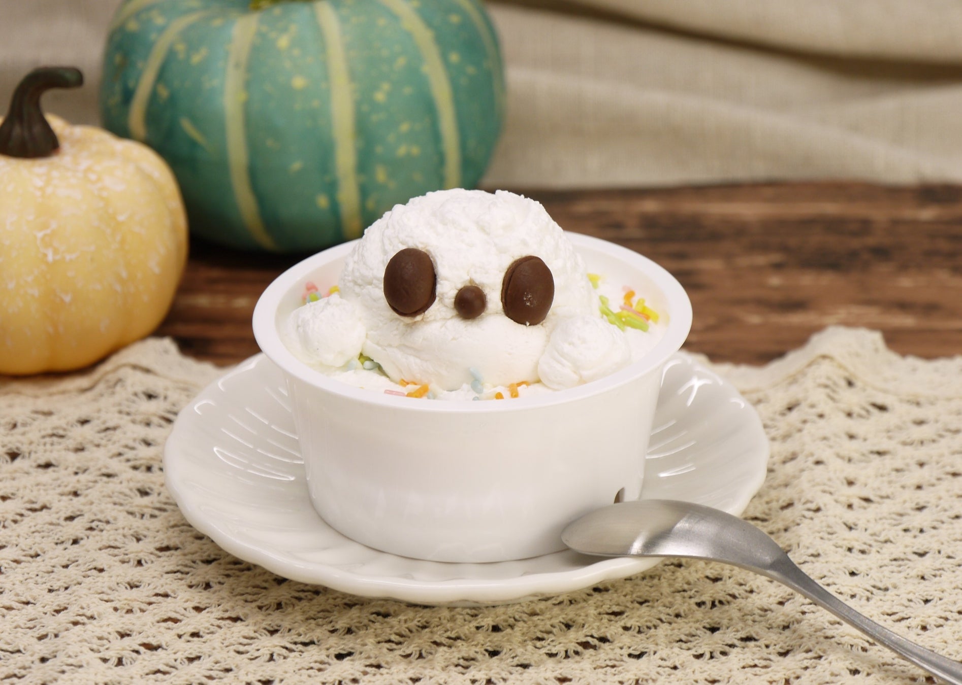 イチゴムースにイチゴソースを重ね、カマンベールチーズ入りのホイップクリームで白いおばけに仕上げています。つぶらな瞳が目を引く、可愛らしい季節限定スイーツです。