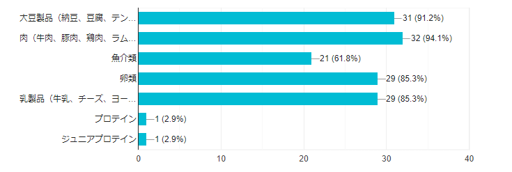 牛肉・豚肉・鶏肉を含む肉類という回答が32票と最も多く、次いで納豆・豆腐・テンペを含む豆類が31票、さらに乳製品、卵が29票と続き、プロテイン、ジュニアプロテイン(各1票)といったプロテインパウダーを大きく引き離しました。ジュニアアスリートのたんぱく質摂取ではプロテインパウダーよりもリアルフードからのたんぱく質摂取を心がけている保護者が多いということがうかがえます。