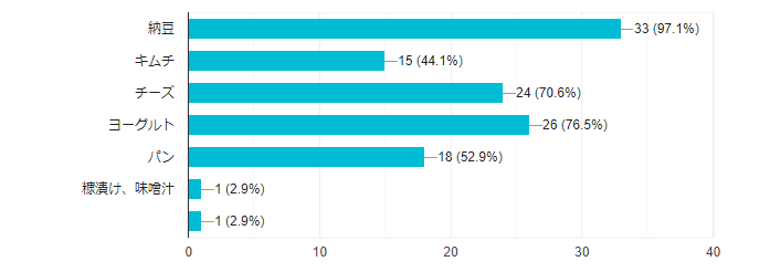 納豆という回答が33票と最も多く、ヨーグルト(26票)、チーズ(24票)という乳製品が続きました。豆類からのたんぱく質摂取は納豆がメインであることがうかがえます。日本ではまだあまりなじみのないテンペ(ナットージャネーゼ)ですが、納豆が食べられない子どもがよろこんで食べてくれたとの回答もあり、今後は納豆同様、ジュニアアスリートのたんぱく質や発酵食品摂取にぜひ貢献していきたいです。アンケートにご協力いただいた保護者のみなさまありがとうございました。