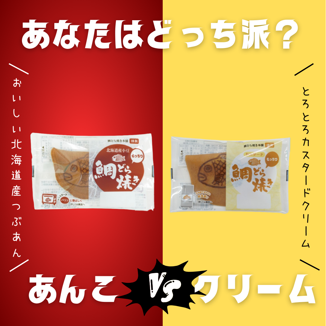 『鯛どら焼き粒あん』は、当社の看板商品である「あゆ菓子」のもっちりしたどら焼き生地に、フードプリンターでとぼけた「鯛」をプリントした「どら焼き+たい焼き」のハイブリッド商品です。北海道小豆の柔らかい粒あんをサンドした商品ですが、『鯛どら焼きカスタード』は、その名の通り、トロ~リなめらかなで味わい深いカスタードを包みました。