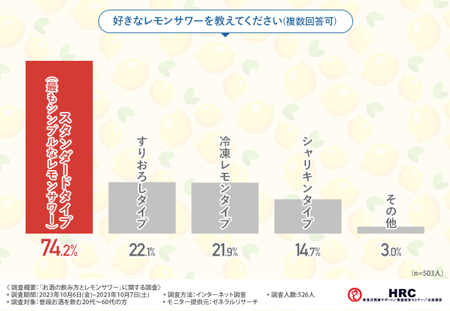 「好きなレモンサワーを教えてください(複数回答可)」と質問したところ、『スタンダードタイプ(最もシンプルなレモンサワー)(74.2%)』と回答した方が最も多く、次いで『すりおろしタイプ(22.1%)』『冷凍レモンタイプ(21.9%)』『シャリキンタイプ(14.7%)』と続きました。